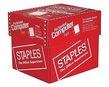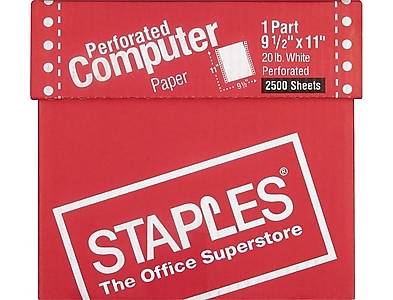 Print invoices, bills of lading or inventory lists with this Staples ultra-perforated blank white 20-pound 9.5 x 11 computer paper. Equip your warehouse, loading dock or production floor with this Staples blank computer paper. The ultra-perforated edges remove effortlessly to leave each sheet free from tears. The continuous page format ensures this Staples blank computer paper stacks neatly for efficient filing. - This continuous paper is perfectly suited for your office dot matrix printer - Brightness rating of 100 for sharp, clear print results - White paper with a smooth finish - Great for professional use - Microperforated This computer paper is perfectly suited for your office's dot matrix printer. This paper is ideal for high-demand offices, designed with ultra-perforated for a fast and smooth tear every time. This computer paper provides high-quality, professional-grade, smudge-free images, perfect for creating stunning projects and reports. Each box has 2,500 sheets of paper, so you won't have to worry about running out in the middle of an important project. Optimal Efficiency This ultra-perforated computer paper was designed with efficiency in mind. This continuous-feed paper is single-part and smooth running for fast printing. It is also micro-perforated for a clean, quick tear every time to keep your data tidy and complete. High-Quality Graphic Quality This blank white paper provides excellent contrast to produce clean, bold and smudge-free images. Use it to create eye-catching and professional client documents, advertisements or invoices. 20 pound paper weight and a 100 brightness rating ensure a vibrant printout that lasts through repeated handling. Ample Quantity Minimize refills of your dot matrix printer with this computer paper. Packaged in large batches of 2,500 sheets per box, it's easy to keep this paper in stock in the office.