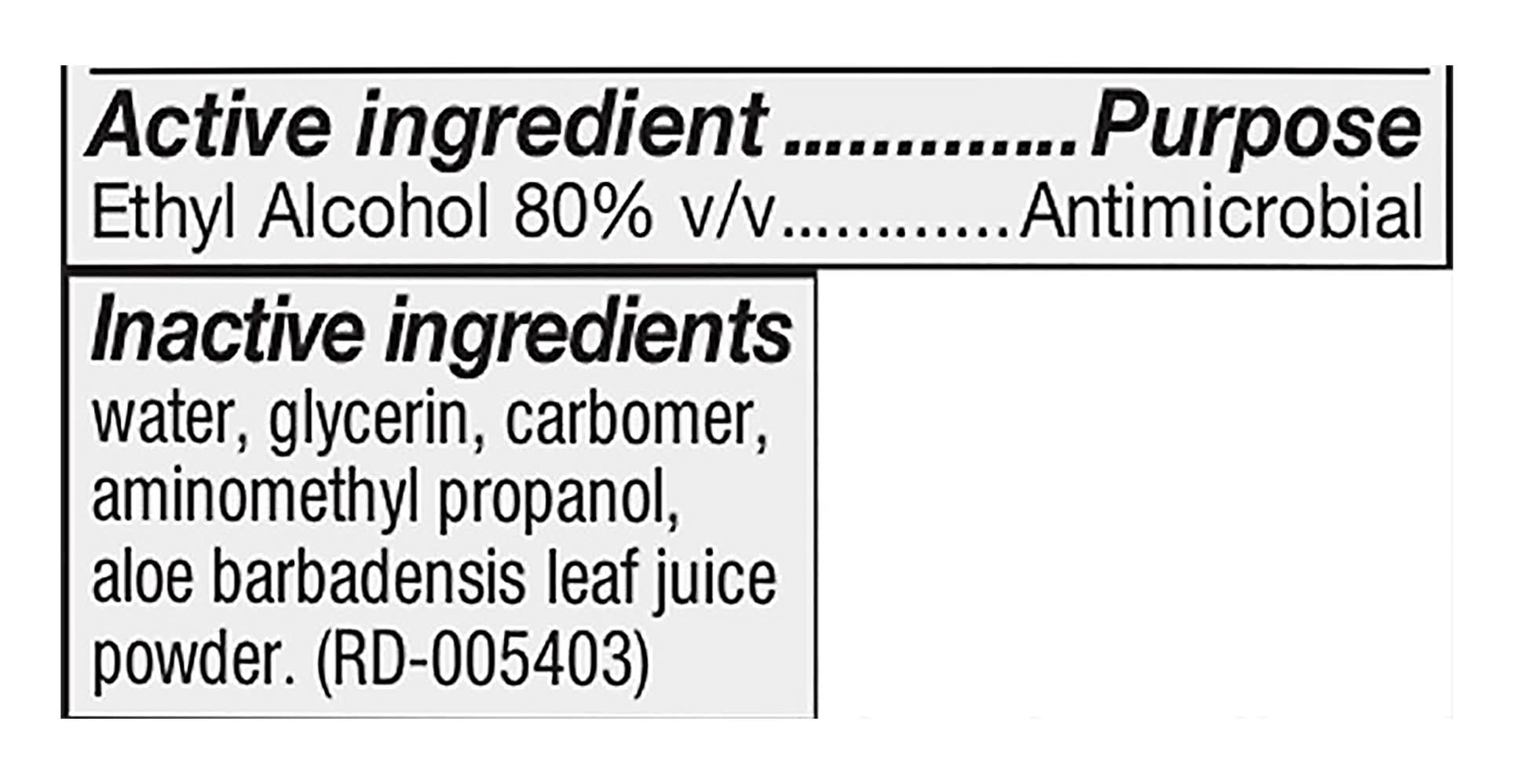 Active Ingredients: Ethyl Alcohol v/v (80 %), Antimicrobial. Inactive Ingredients: Water, Glycerin, Carbomer, Aminoethyl Propanol, Aloe Barbadensis Leaf Juice Powder