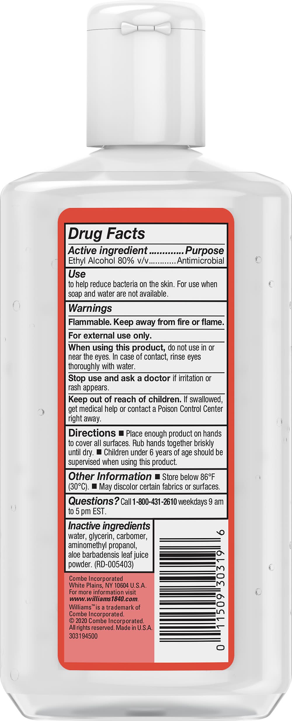 Other Information: Store below 86 degrees F (30 degrees C). May discolor certain fabrics or surfaces. America's original soap company. Est. 1840. 80% USP alcohol. Kills 99.99% of many common bacteria. With moisturizing glycerin + aloe. pH balanced. Fragrance free. Phamaceutical grade. www.williams1840.com. Questions? Call 1-800-431-2610 weekdays 9 am to 5 pm EST. For more information visit www.williams1840.com. Made in U.S.A. Combe Incorporated, White Plains, NY, 10604, Ph: 800-431-2610