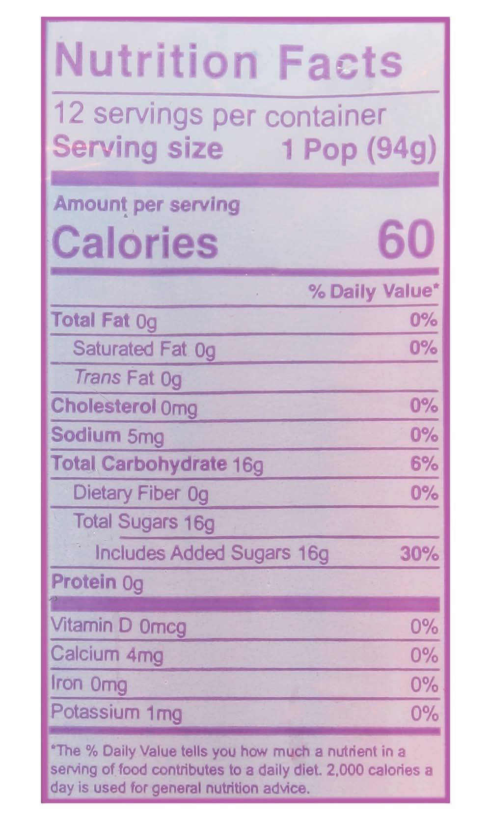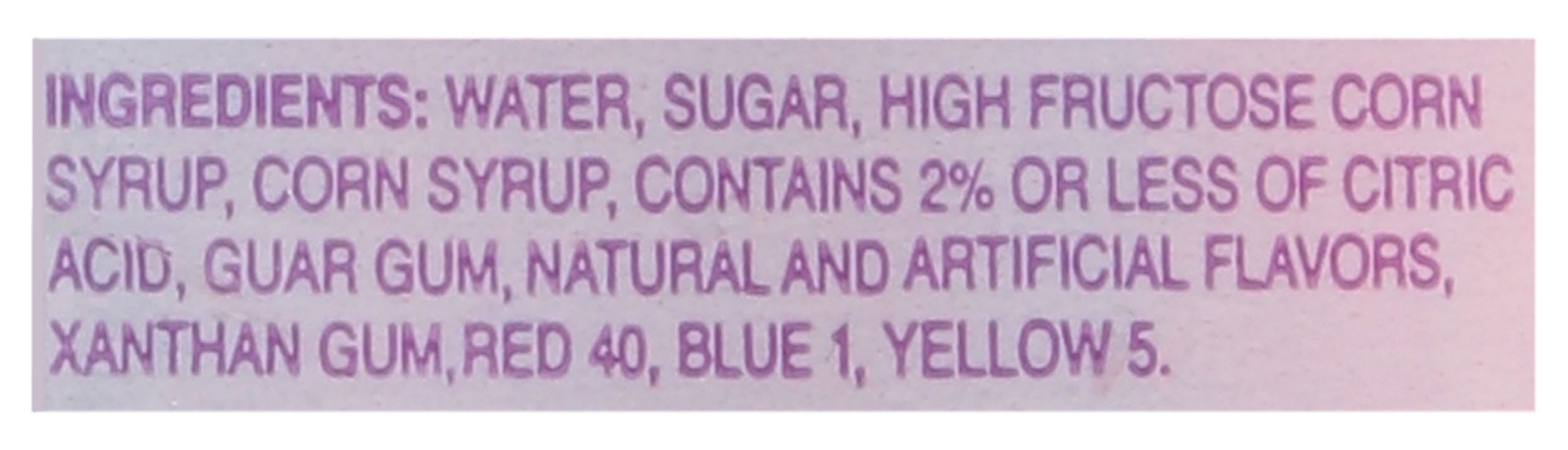 Water, Sugar, High Fructose Corn Syrup, Corn Syrup, Contains 2% or Less of Citric Acid, Guar Gum, Natural and Artificial Flavors, Xanthan Gum, Red 40, Blue 1, Yellow 5