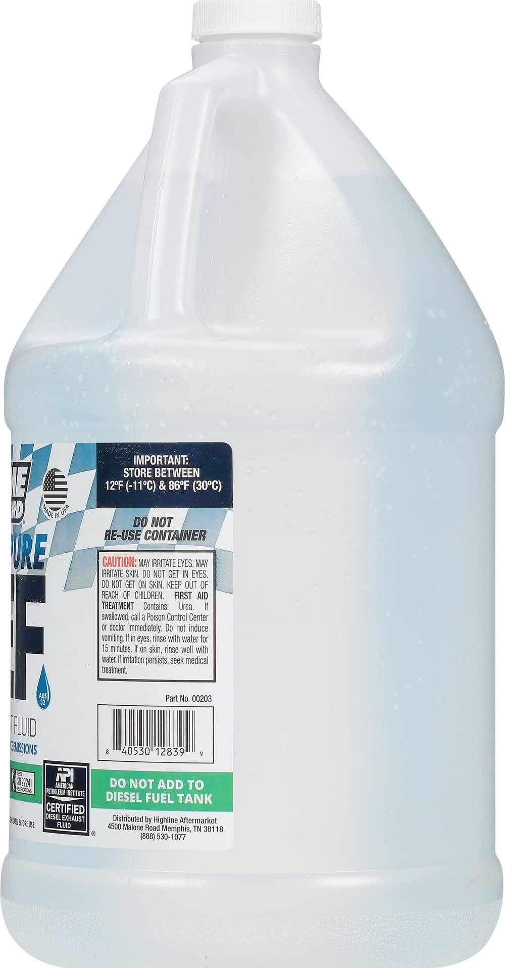 AUS32. Improves mileage. Reduce emissions. Approved for SCR equipped engines. Meets ISO 22241 specifications. API: American Petroleum Institute certified diesel exhaust fluid. Made in USA. • Highline Aftermarket, • Packaging: Reusable
