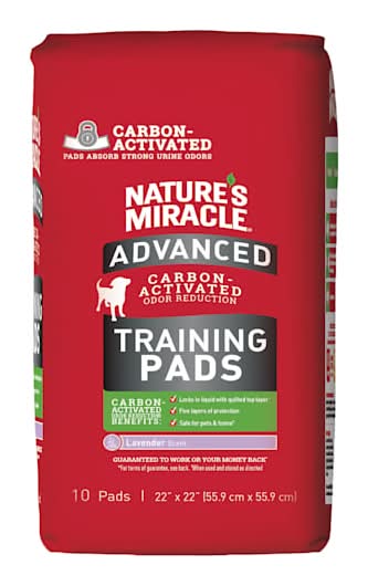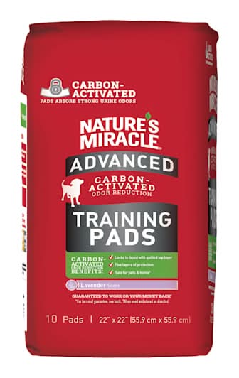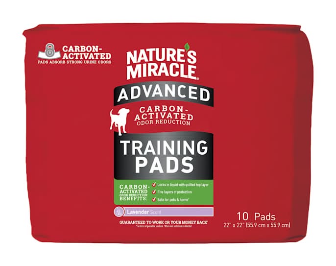 Nature's Miracle Advanced Training Pads feature carbon activated odor reduction that locks in liquid with a quilted top layer and five layers of protection. These pads are also designed with adhesive tabs and a fresh lavender scent. Simply unfold the pad and place plastic side down on the floor in the area where you would like your pet to "go." Make sure the pad is placed away from pet bedding and food. The pet should have access to the pad throughout the day and evening. Change the pad as needed! These carbon activated pads are safe for your pets and home, when used and stored as directed. Size: 22x22 in