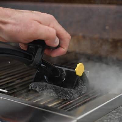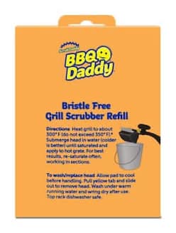 With BBQ Daddy you don't have to worry about dangerous wire bristles found on most common barbeque brush products. Flexible stainless-steel fibers woven throughout the head's ArmorTec mesh outer tear through tough grime without shedding. Water activated design cleans with the power of steam thanks to a core made of Scrub Daddy's exclusive FlexTexture foam. Submerge the scrubbing head in cold water and apply directly to your preheated grill. Watch months of cooking residue melt away with this steam grill brush for outdoor grill. Step up your grill accessories game with BBQ Daddy. Directions: Heat grill to about 300° F (do not exceed 350° F).* Submerge head in water (colder is better) until saturated and apply to hot grate. For best results re-saturate often, working in sections. To wash/replace head: Allow pad to cool before handling. Pull yellow tab and slide out to remove head. Wash under warm running water and wring dry after use. Top rack dishwasher safe.