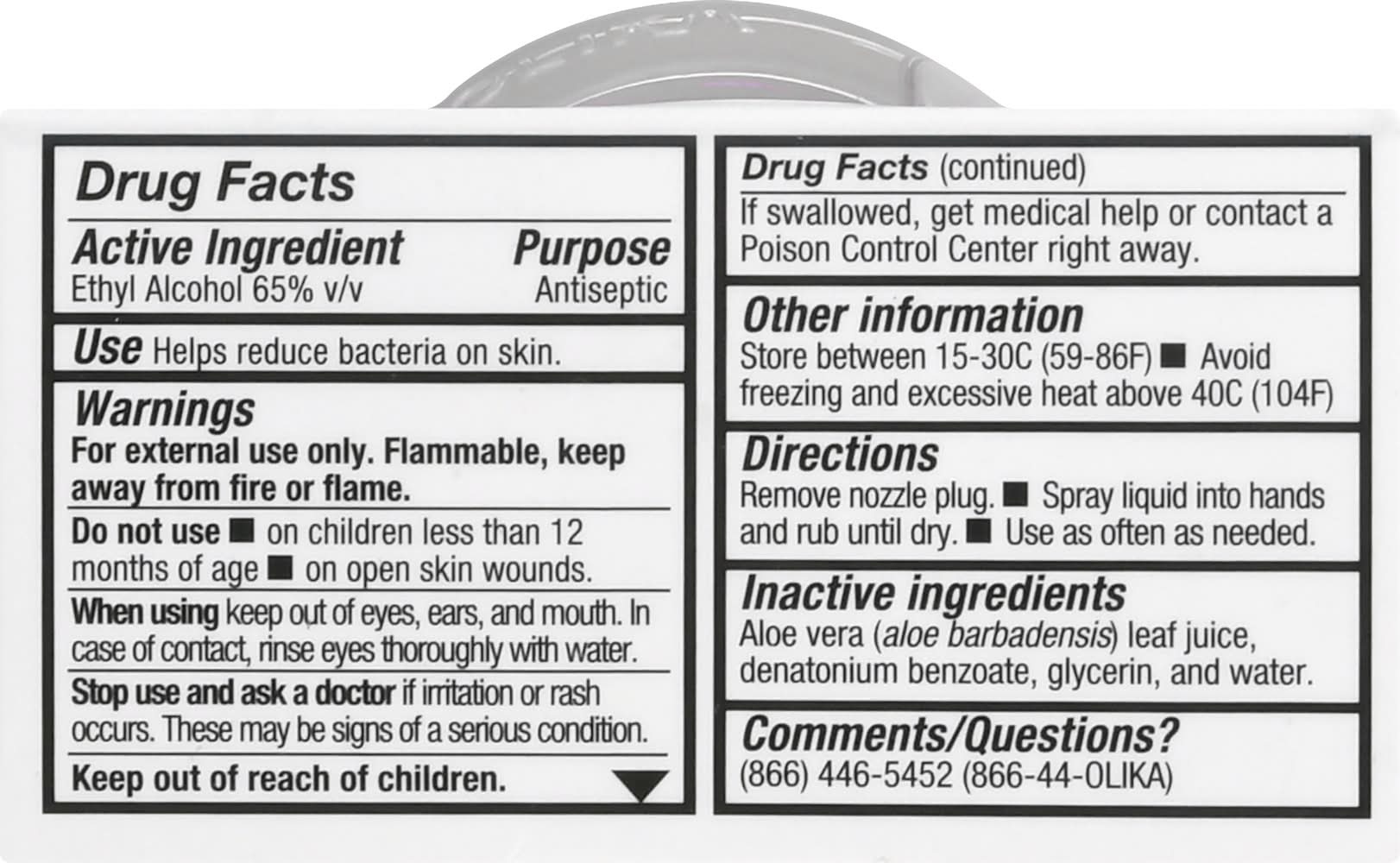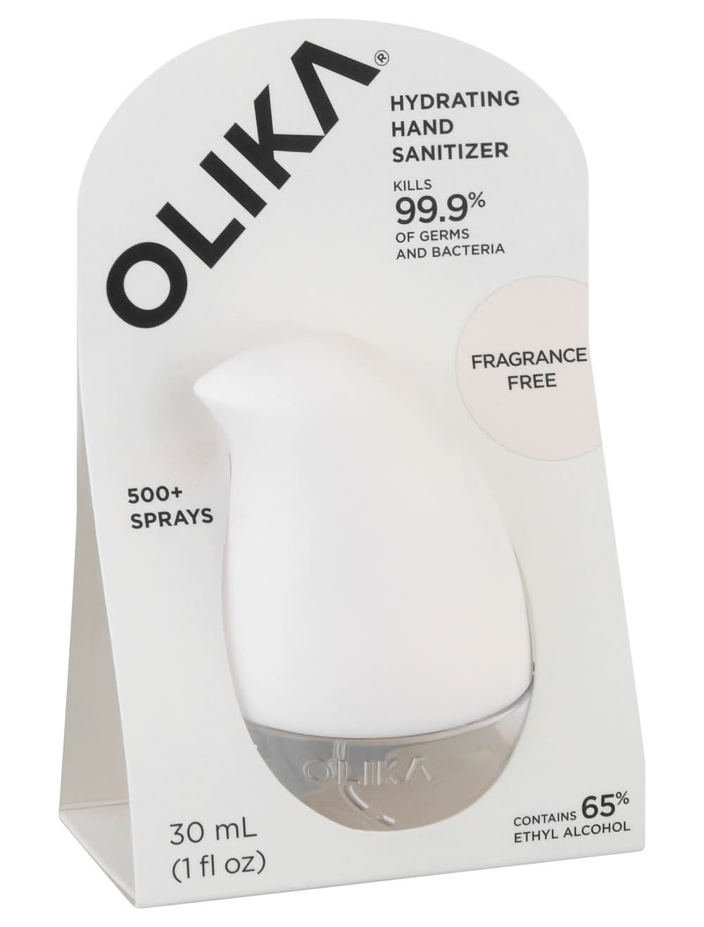 Other Information: Store between 15-30C (59-86F). Avoid freezing and excessive heat above 40C (104F). Contains 65% ethyl alcohol. 500+ sprays. Kills 99.9% of germs and bacteria. Fragrance free. Clean hands. No cracks. If your hand sanitizer dries out of your skin and causes it to crack or peel, it could be exposing you to harmful bacteria. Olika hydrates and soothes your skin while removing germs and bacteria. Our elegant, ergonomic dispenser fits nicely into one hand while spray it onto the other. Find out what's different about Olika. Long-lasting hydration. Vegan formulation with simple ingredients. 15x more uses than similar sized gels. olikalife.com. Facebook. Twitter. Instagram. (at)olikalife. Learn more at olikalife.com. Get refills at olikalife.com. Comments/questions? (866) 446-5452. (866-44-OLIKA). Not tested on animals. FSC: 100%. Designed in California. Assembled in China. Perkin & Perkin,