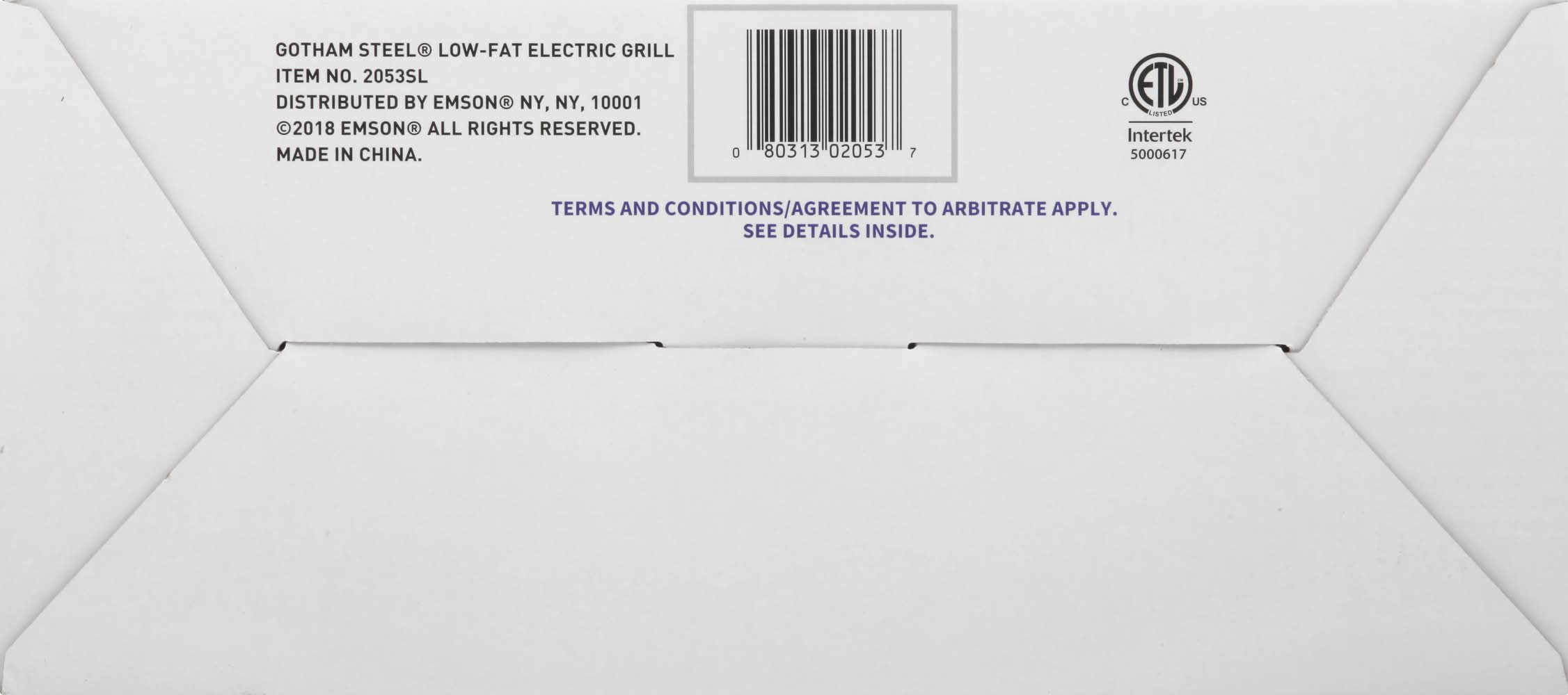 Less fat! Less grease! Less calories! Easy to clean. Non stick grill plates. PTFE/PFOA/PFOS free. As seen on TV. Non-stick titanium copper & ceramic stronger than ever! Grills food fast! Grills All Your Favorite Food: burgers; steaks; sandwiches; vegetables; seafood & more! No oil or butter needed! Drip tray included inside. Fat & grease collect in drip tray as food cooks! Non-Stick! Ti-Cerama Copper Coating. Terms and conditions/agreement to arbitrate apply. See details inside. ETL Listed-Intertek. Made in China. Emson,