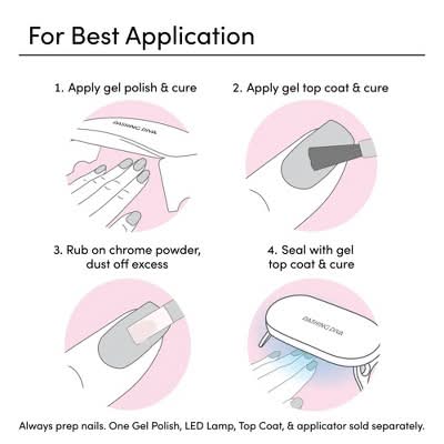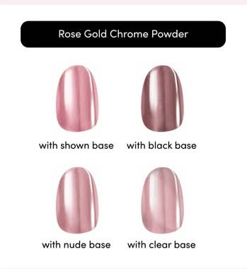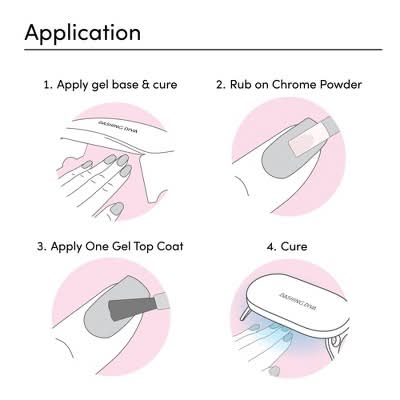 A premium-quality chrome powder made with fine pigments that instantly transforms any color you apply it to. Must be sealed with One Gel Top Coat or any traditional gel topcoat. Same powder as the one sold in our Chromagic kits. Includes: 1 chrome powder How to apply Step 1:Prep Clean nails with soap and water. Shape nails and push back cuticles using manicure stick. Lightly buff nail beds with a buffer to remove natural shine and create subtle texture. Wipe nails with alcohol to ensure nail beds are clear from oils/residue. Make sure nails are completely dry before application. Step 2 option 1: Apply one gel Shake bottle well before use. Pick up a small amount of polish on the brush and apply one ultra-thin coat of gel to nails, starting from the middle of the nail bed. Using the One Gel Lamp*, cure the polish for 60 seconds. Apply a second coat of gel polish to nails, then cure. For desired opacity, apply a third coat. Pro Tip: Curing results may vary if an LED lamp from another brand is used with One Gel. Step 2 Option 2: Apply gel. Apply any gel base coat and gel color according to specific product instructions. Step 3 Option 1: Apply one gel top coat Apply a thin coat of One Gel Top Coat and cure for 60 seconds using the One Gel Lamp. Step 3 Option 2: Apply topcoat Apply any gel topcoat and cure according to specific product instructions. Note: Chrome powder will not adhere well if topcoat is not applied and cured properly. Step 4: Apply chrome: Using the included powder applicator, firmly rub an ample amount of the powder all over the nail bed until there is an even chrome shine on the nail. Dust off any excess chrome powder. Step 5 Option 1: Seal with one gel top coat. Apply a thin layer of One Gel Top Coat over the chrome powder and cure for 60 seconds using the One Gel Lamp. Step 5 Option 2: Seal with gel topcoat. Apply a thin layer of gel topcoat over the chrome powder and cure according to specific directions. Pro Tip: For optimal adhesion, avoid exposing nails to lotions, oils, or water for at least one hour after application. How to remove. Scratch the surface of the nail using a nail file until all shine is gone. Apply a thick layer of Magic Off on remaining gel polish, avoiding contact with skin. Let product sit until gel polish starts to bubble into pieces (3 minutes). Gently scrape the gel polish off nails using a cuticle pusher. Repeat until all polish is removed. Pro Tips: Focus on cleaning your cuticles well before applying to achieve the smoothest look, as the chrome powder will exaggerate any bumps around the cuticle line. For the chrome finish to appear seamless, ensure gel polish is not pooling in any area of the nails before curing. An even coat of gel polish will help the polish last. If the powder is not sticking to your nail, press the applicator down extra firmly to ensure an even coat. To avoid any uncomfortable sensation around the skin, apply cuticle oil on the skin before using One Gel Magic Off. Compatible with all DD products, including Chromagic, One Gel, Gloss, Glaze, Magic Press, GelXtend, and nailbliss. Color: Rose gold chrome
