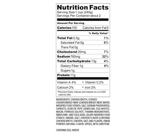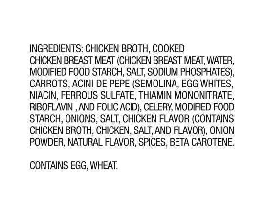 Chicken Broth, Cooked Chicken Breast Meat (Chicken Breast Meat, Water, Modified Food Starch, Salt, Sodium Phosphates), Carrots, Acini De Pepe (Semolina, Egg Whites, Niacin, Ferrous Sulfate, Thiamin Mononitrate, Riboflavin, and Folic Acid), Celery, Modified Food Starch, Onions, Salt, Chicken Flavor (contains Chicken Broth, Chicken, Salt, and Flavor), Onion Powder, Natural Flavor, Spices, Beta Carotene Contains: Eggs, Gluten, Wheat