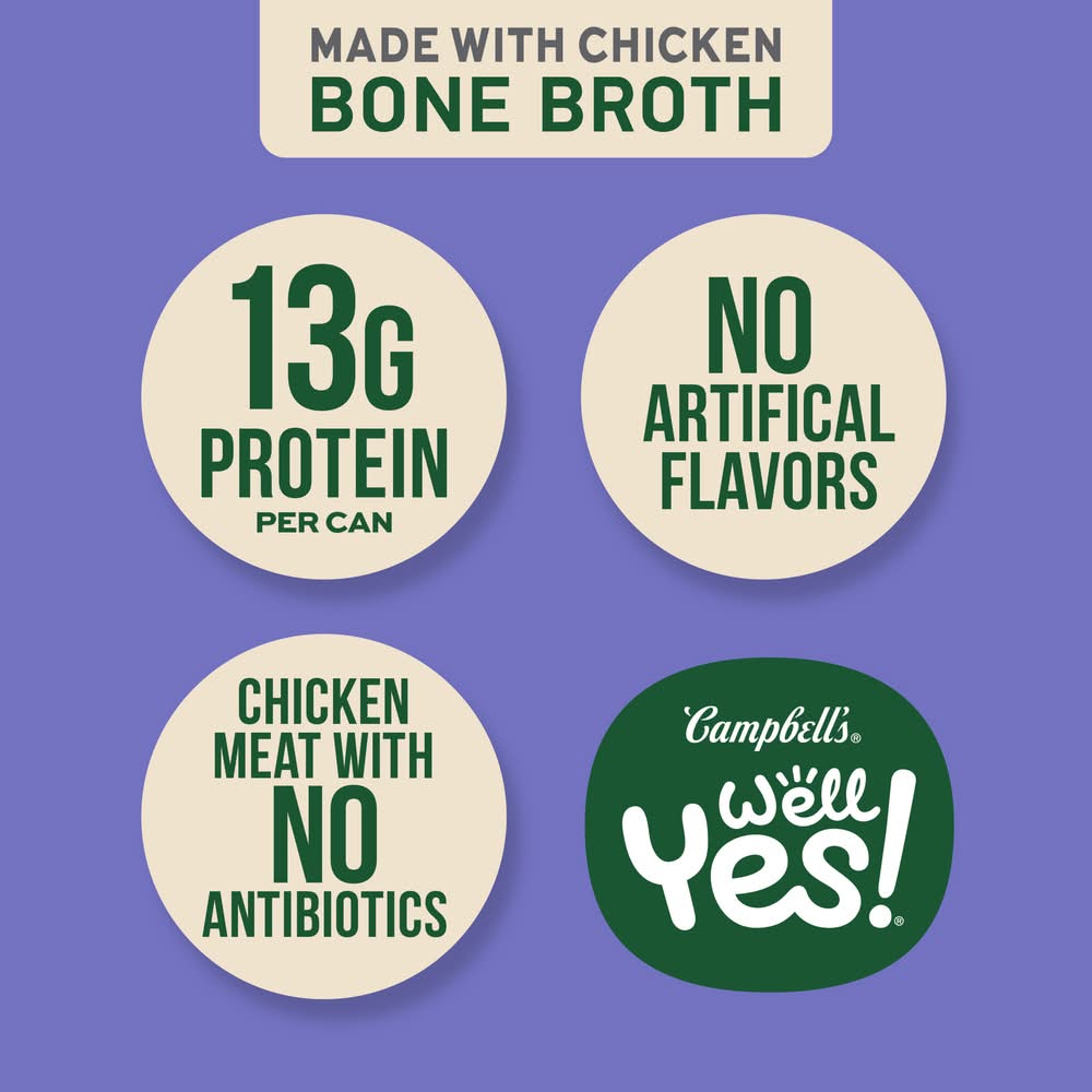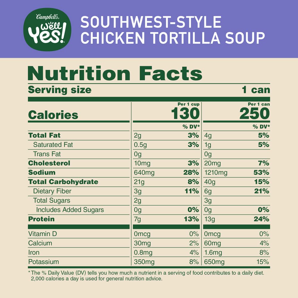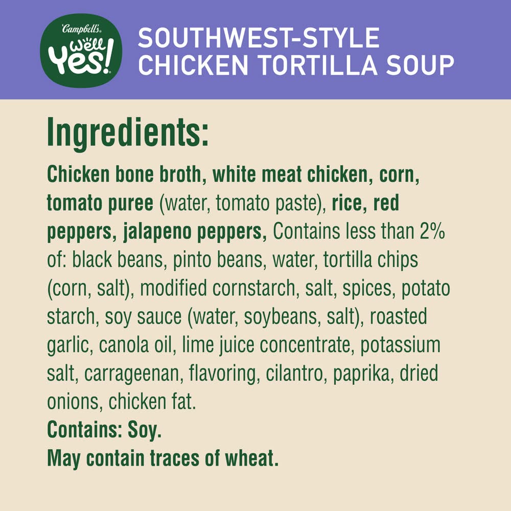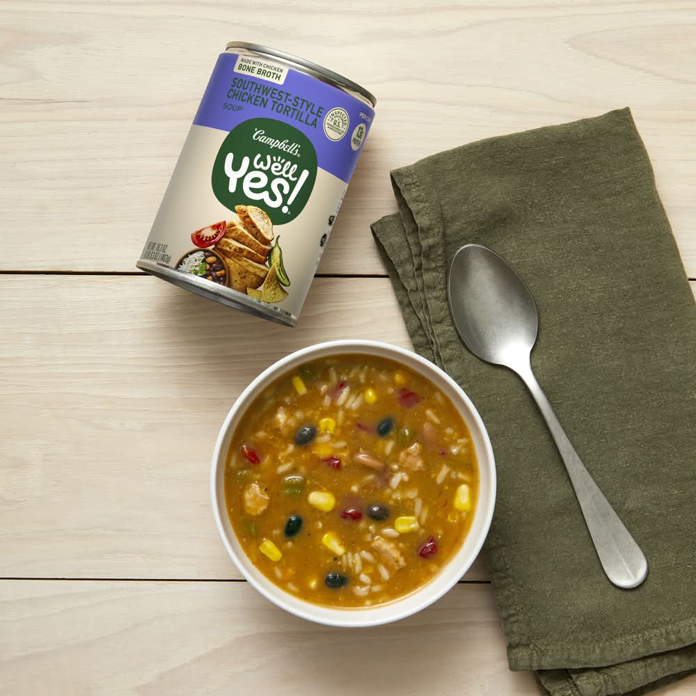Actively nourish your positive lifestyle with the delicious flavors of Campbell's Well Yes! Southwest Style Chicken Tortilla Soup. Each can of this soup is made to satisfy with nutritious ingredients you could find in your kitchen. A different take on a classic favorite, this canned soup is deliciously crafted with tender chicken raised without antibiotics, plus corn, tomato, rice and peppers in nourishing chicken bone broth. This chicken soup contains 13 grams of protein per can and delivers positive nutrition in every bite. Well Yes! soup is made with no added preservatives, no high fructose corn syrup and no artificial colors or flavors, so you can feel good about incorporating this nourishing choice into your daily routine. Finally, something your body and taste buds can agree on. For delicious anytime nourishment, just pop this soup into a saucepan or microwave-safe bowl, heat and enjoy. Or, serve it up as a tasty appetizer or side dish. The soup can is recyclable for sustainable disposal. • Campbell Soup Company, Camden,NJ,08103-1701 • Packaging: Reusable