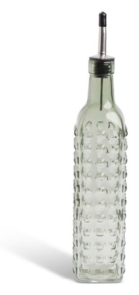 This 17oz colored textured glass cruet elegantly stores oil or vingear in. Easily dispenses liquid without drips or spills.