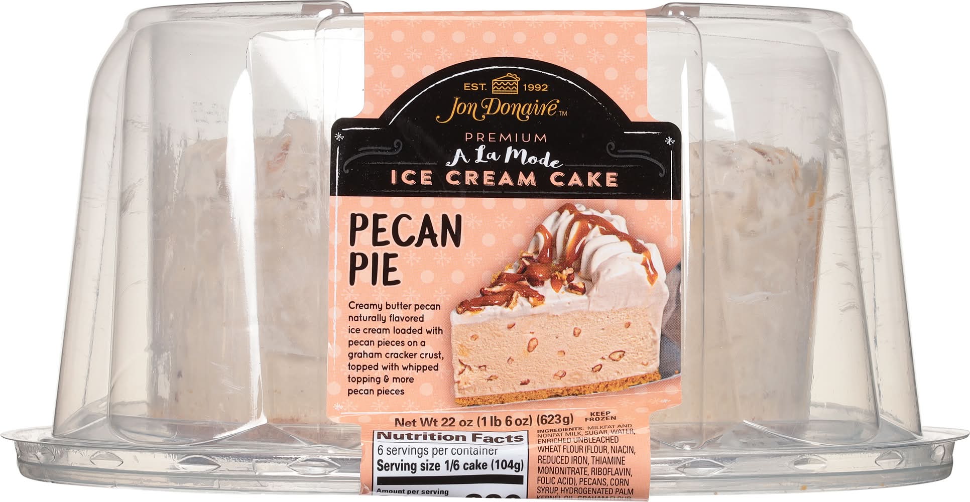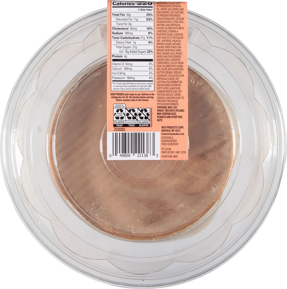 Creamy butter pecan naturally flavored ice cream loaded with pecan pieces on a graham cracker crust, topped with whipped topping & more pecan pieces. Contains a bioengineered food ingredient. Est. 1992. iloveicecreamcakes.com. how2recycle.info. Rich Products Corp.,