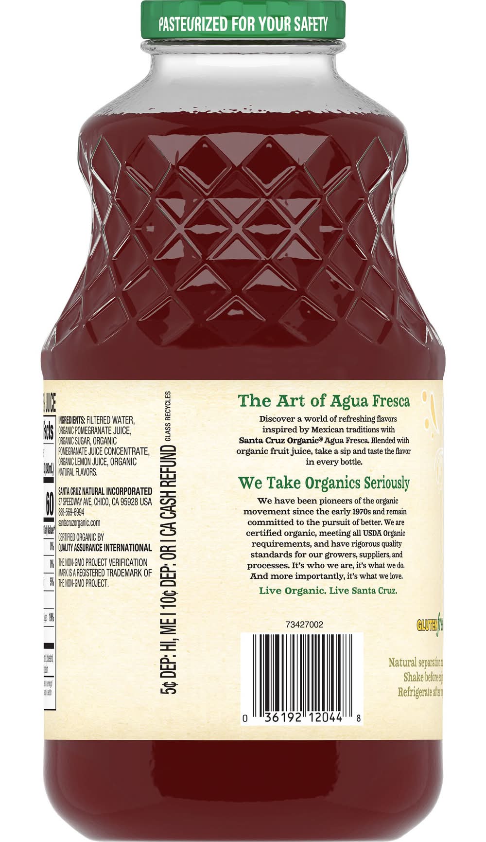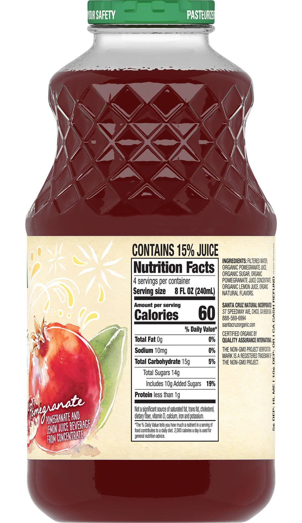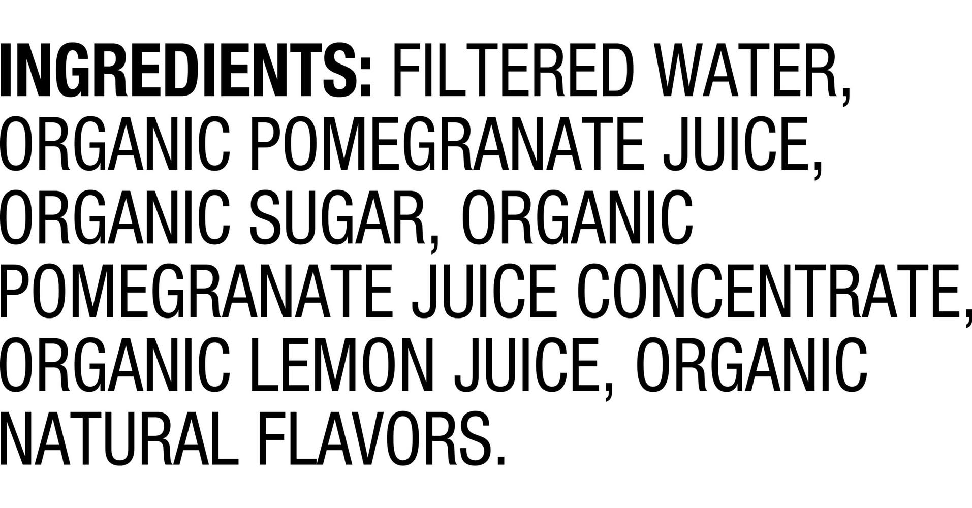 Filtered Water, Organic Pomegranate Juice, Organic Sugar, Organic Pomegranate Juice Concentrate, Organic Lemon Juice, Organic Natural Flavors.