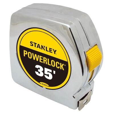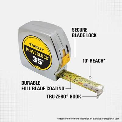 STANLEY POWERLOCK tapes fit your toolbelt, your hand, and the job. 10 ft. of reach* and a durable case make this tape dependable on any jobsite. Tru-Zero hook end provides accurate inside/outside measurements and the secure blade looks keeps tape blade from moving while measuring. Protective full tape blade coating extends tape life against abrasion and heavy use**. Size: 35 Ft
