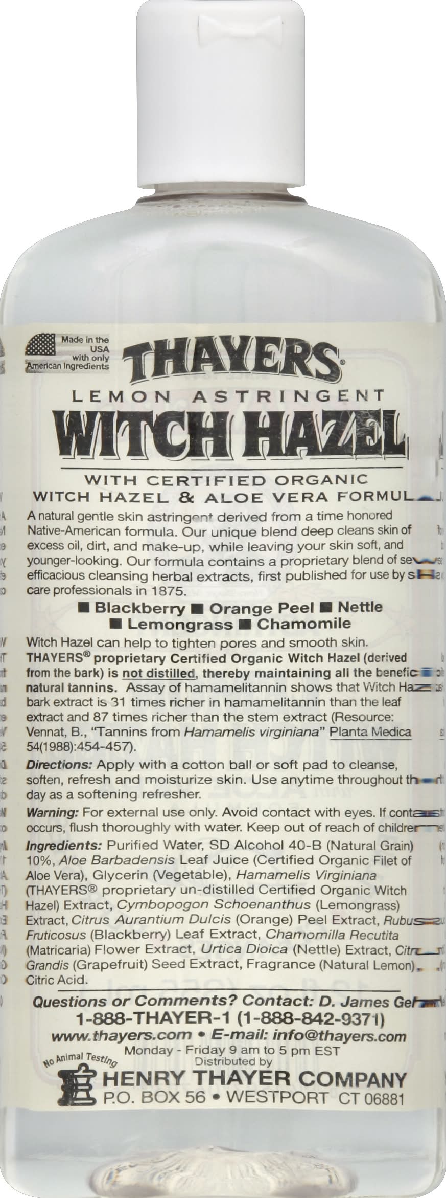 Purified Water, SD Alcohol 40-B Natural Grain 10%, Aloe Barbadensis Leaf Juice Certified Organic Filet of Aloe Vera, Glycerin Vegetable, Hamamelis Virginiana Thayers Proprietary Un-Distilled Certified Organic Witch Hazel Extract, Cymbopogon Schoenanthus Lemongrass Extract, Citrus Aurantium Dulcis Orange Peel Extract, Rubus Fruticosus Blackberry Leaf Extract, Chamomila Recutita Matricaria Flower Extract, Urtica Dioica Nettle Extract, Citrus Grandis Grapefruit Seed Extract, Fragrance Natural Lemon, Citric Acid. Contains: None Additives: None