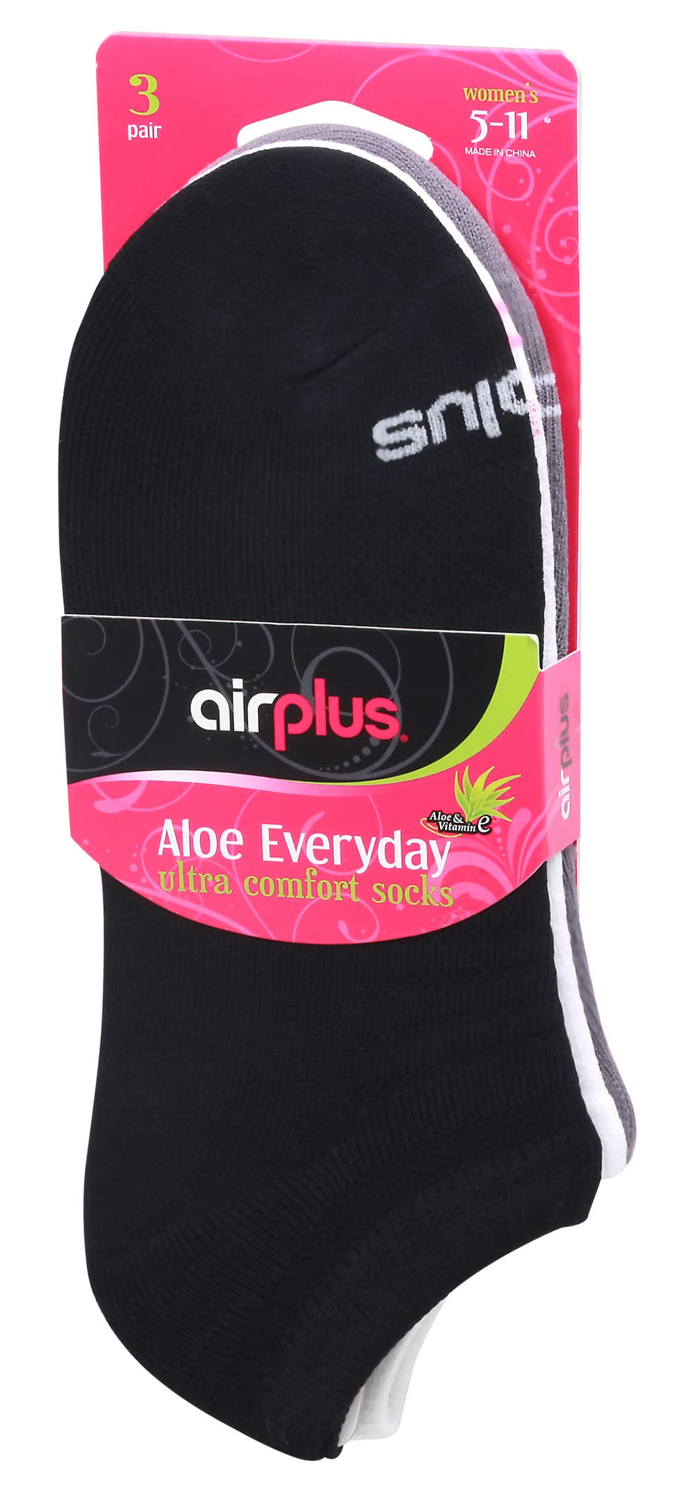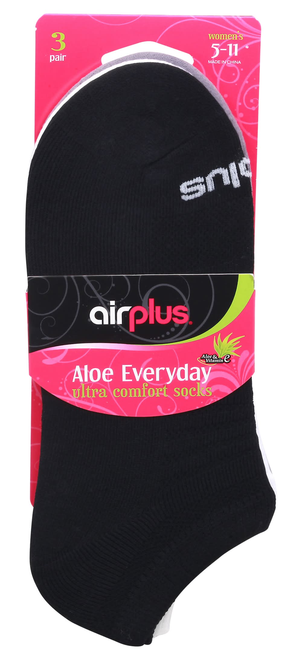 Aloe & vitamin E. Pamper yourself with the Airplus Aloe Everyday sock. Work, exercise, or relax in unbelievable comfort while your feet are soothed and re-energized. Ribbed comfort top says up. Arch band for secure fit. Comfort toe seam. Deep heel construction provides excellent fit and prevents slippage. We stand for comfort. airplusfootcare.com. Made in China. Implus LLC,