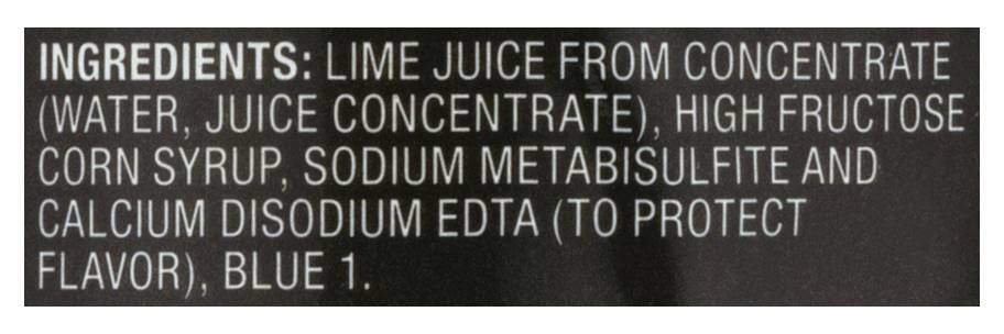Lime Juice from Concentrate (Water, Juice Concentrate), High Fructose Corn Syrup, Sodium Metabisulfite and Calcium Disodium EDTA (to Protect Flavor), Blue 1.