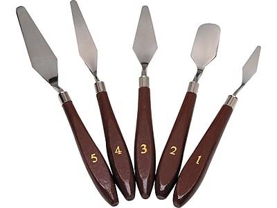 Create high-quality artwork with this Darice Creative Collection painting knife set. Help students develop their skills with this painting knife set. The assorted shapes and styles let you practice a variety of techniques, while the wood handles deliver a comfortable grip for easy use. Sharpened cutting edges make paint mixing and application fast, and the five different sizes offer versatile options. All components of this Darice Creative Collection painting knife set feature flexible stainless steel blades for durability. - Painting knives have flexible blades for mixing paint or for painting with heavy oil-based paints direct to canvas - Comes in silver/brown colors - Package contains knives: #1, #2, #3, #4, and #5 sizes - one of each size - Save your paintbrushes by mixing paint with this painting knives