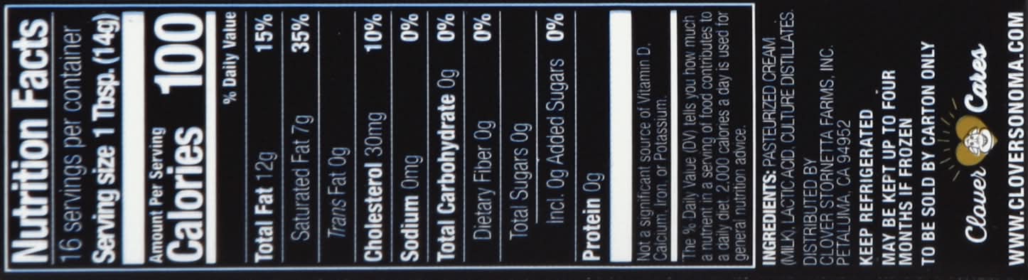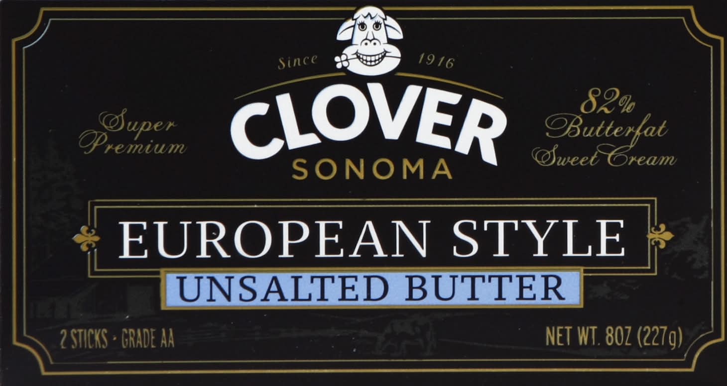 Super premium. Since 1916. 82% butterfat sweet cream. Grade AA. www.Cloversonoma.com. The first time you bite into a flaky pie crust or warm cookie made with Clover European Style Butter, you'll understand why it's the butter of choice for master bakers and home chefs alike. Slow churned in the European style, it is higher in butterfat, which intensifies the rich buttery flavor. Ideal for baking, sautees and sauces - but also fantastic on a warm slice of toast. Welcome to Clover Country: For three generations, we've been bringing you the highest quality dairy products, while pioneering animal welfare standards and protecting our lands for future generations. Clover Stornetta Farms, Petaluma, CA 94952