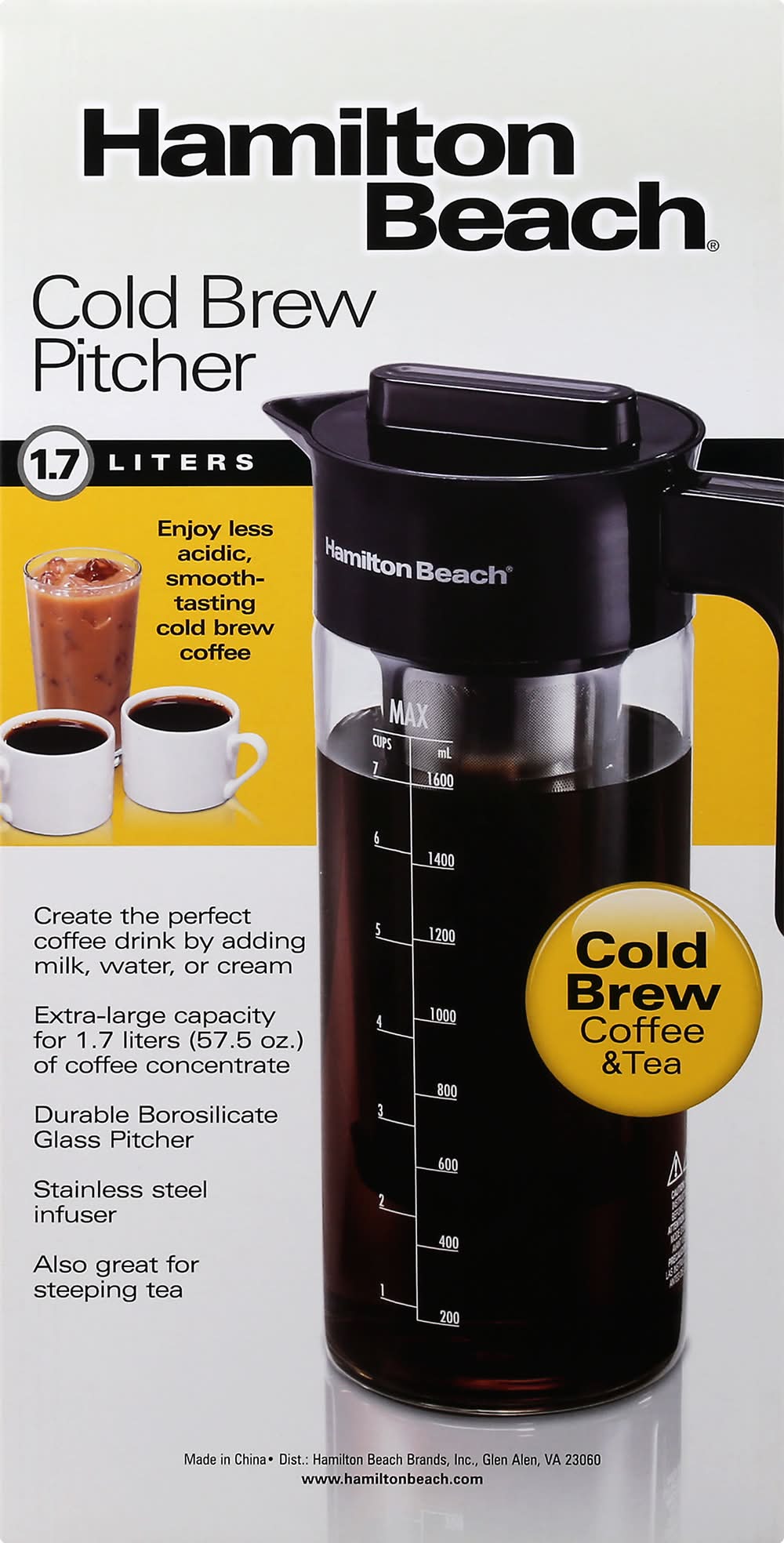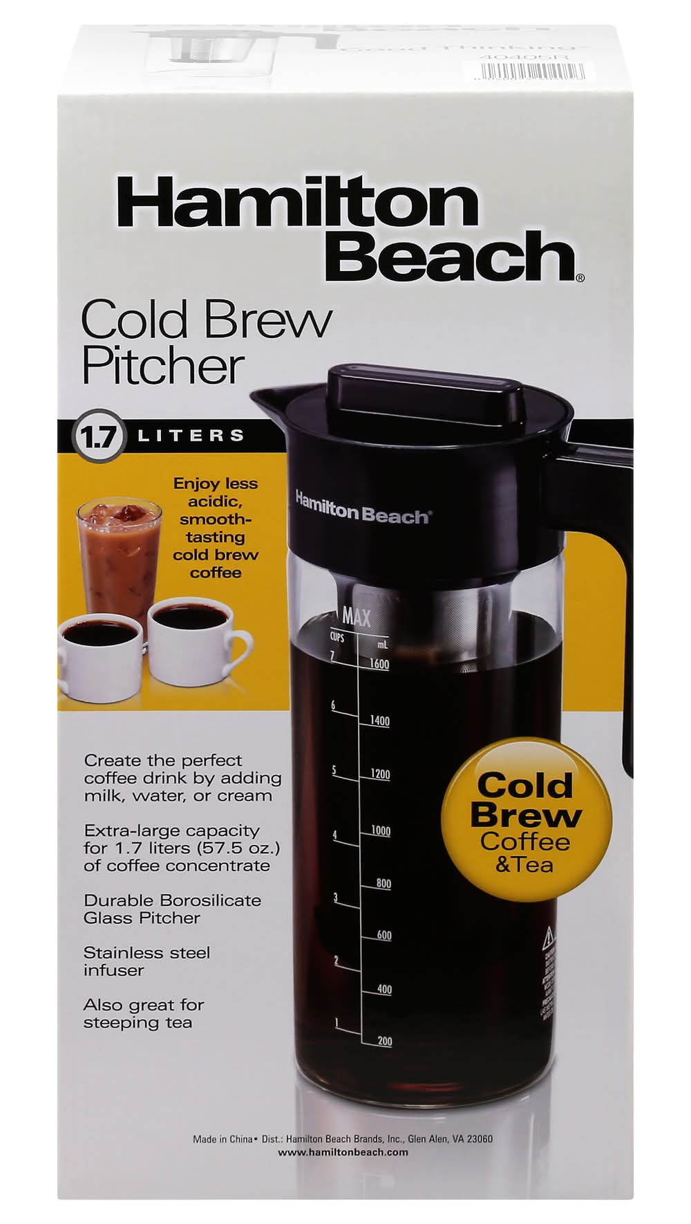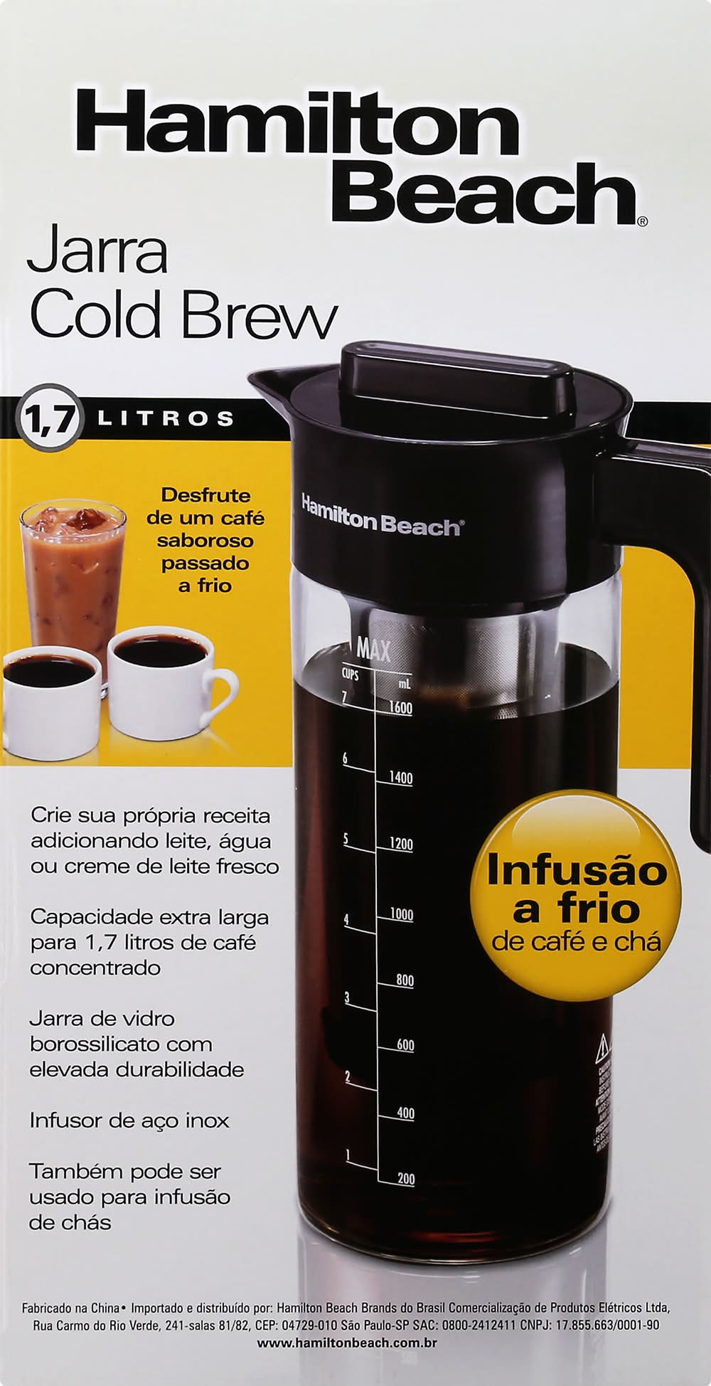 Enjoy less acidic, smooth-tasting cold brew coffee. Create the perfect coffee drink by adding milk, water, or cream. Extra-large capacity for 1.7 liters (57.5 oz.) of coffee concentrate. Durable borosilicate glass pitcher. Stainless steel infuser. Also great for steeping tea. Cold brew coffee & tea. For household use only. Type AC27. 820341301. Enclosed product may vary slightly from that shown in photograph. www.hamiltonbeach.com. www.hamiltonbeach.ca. Question? USA 1-800-851-8900; Mexico 01-800-711-6100; Canada 1-800-267-2826; Brasil 0800-241-2411. Recyclable carton in the few communities that recycle paperboard. Made in China. • Hamilton Beach, • Packaging: Reusable