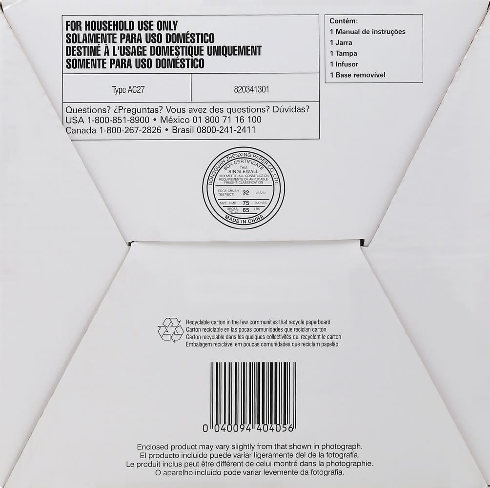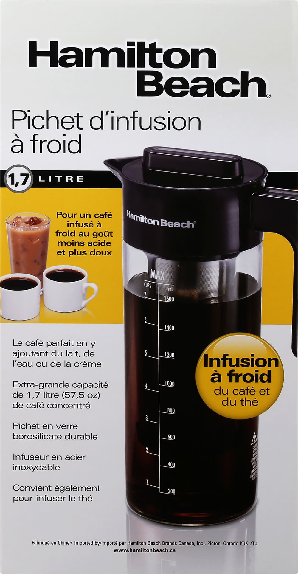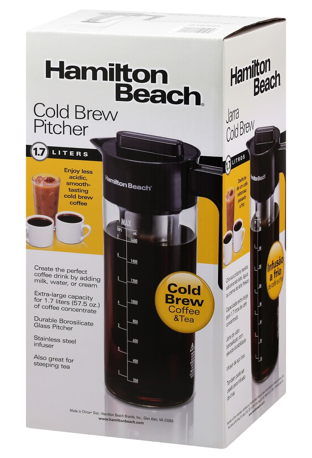 Enjoy less acidic, smooth-tasting cold brew coffee. Create the perfect coffee drink by adding milk, water, or cream. Extra-large capacity for 1.7 liters (57.5 oz.) of coffee concentrate. Durable borosilicate glass pitcher. Stainless steel infuser. Also great for steeping tea. Cold brew coffee & tea. For household use only. Type AC27. 820341301. Enclosed product may vary slightly from that shown in photograph. www.hamiltonbeach.com. www.hamiltonbeach.ca. Question? USA 1-800-851-8900; Mexico 01-800-711-6100; Canada 1-800-267-2826; Brasil 0800-241-2411. Recyclable carton in the few communities that recycle paperboard. Made in China. • Hamilton Beach, • Packaging: Reusable