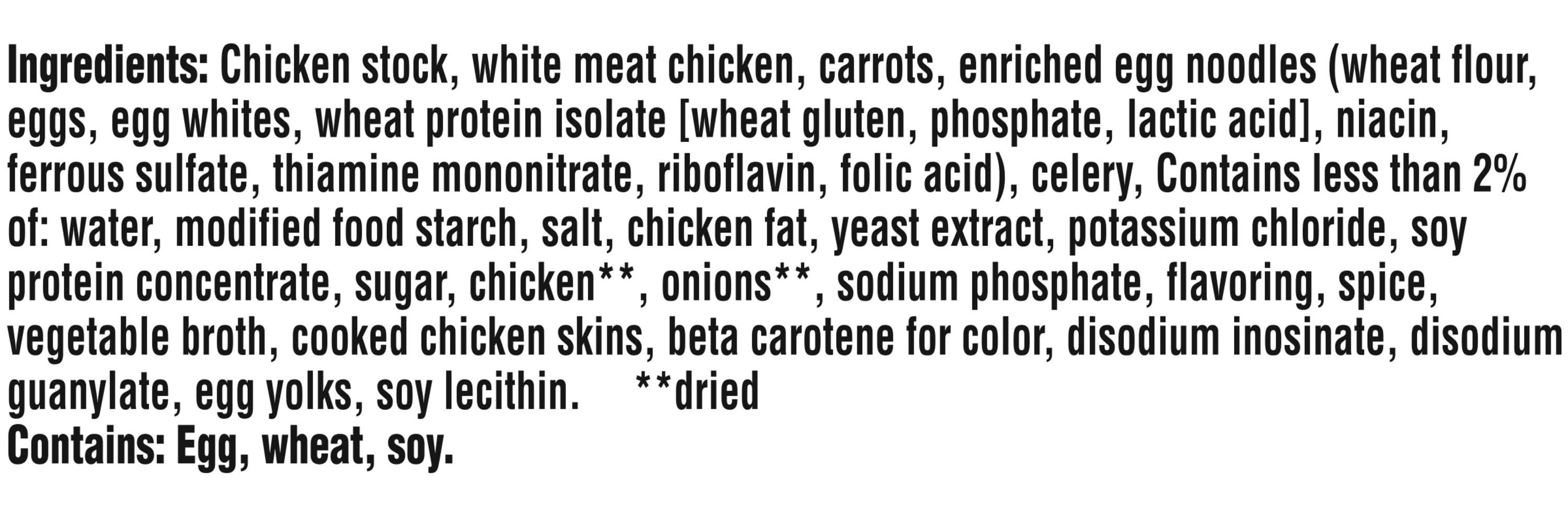 Ingredients: INGREDIENTS: CHICKEN STOCK, WHITE MEAT CHICKEN, CARROTS, ENRICHED EGG NOODLES (WHEAT FLOUR, EGGS, EGG WHITES, WHEAT PROTEIN ISOLATE [WHEAT GLUTEN, PHOSPHATE, LACTIC ACID], NIACIN, FERROUS SULFATE, THIAMINE MONONITRATE, RIBOFLAVIN, FOLIC ACID), CELERY, CONTAINS LESS THAN 2% OF: WATER, MODIFIED FOOD STARCH, SALT, CHICKEN FAT, YEAST EXTRACT, POTASSIUM CHLORIDE, SOY PROTEIN CONCENTRATE, SUGAR, CHICKEN**, ONIONS**, SODIUM PHOSPHATE, FLAVORING, SPICE, VEGETABLE BROTH, COOKED CHICKEN SKINS, BETA CAROTENE FOR COLOR, DISODIUM INOSINATE, DISODIUM GUANYLATE, EGG YOLKS, SOY LECITHIN. **DRIED CONTAINS: EGG, WHEAT, SOY. Contains: CONTAINS: Egg, Gluten, Soybean, Wheat