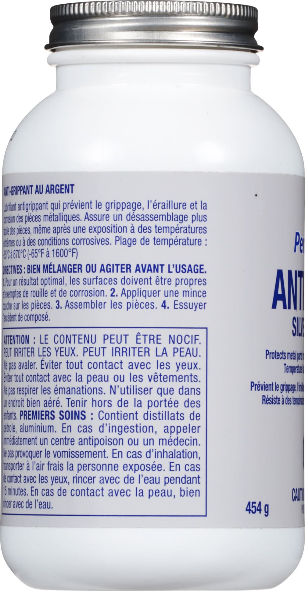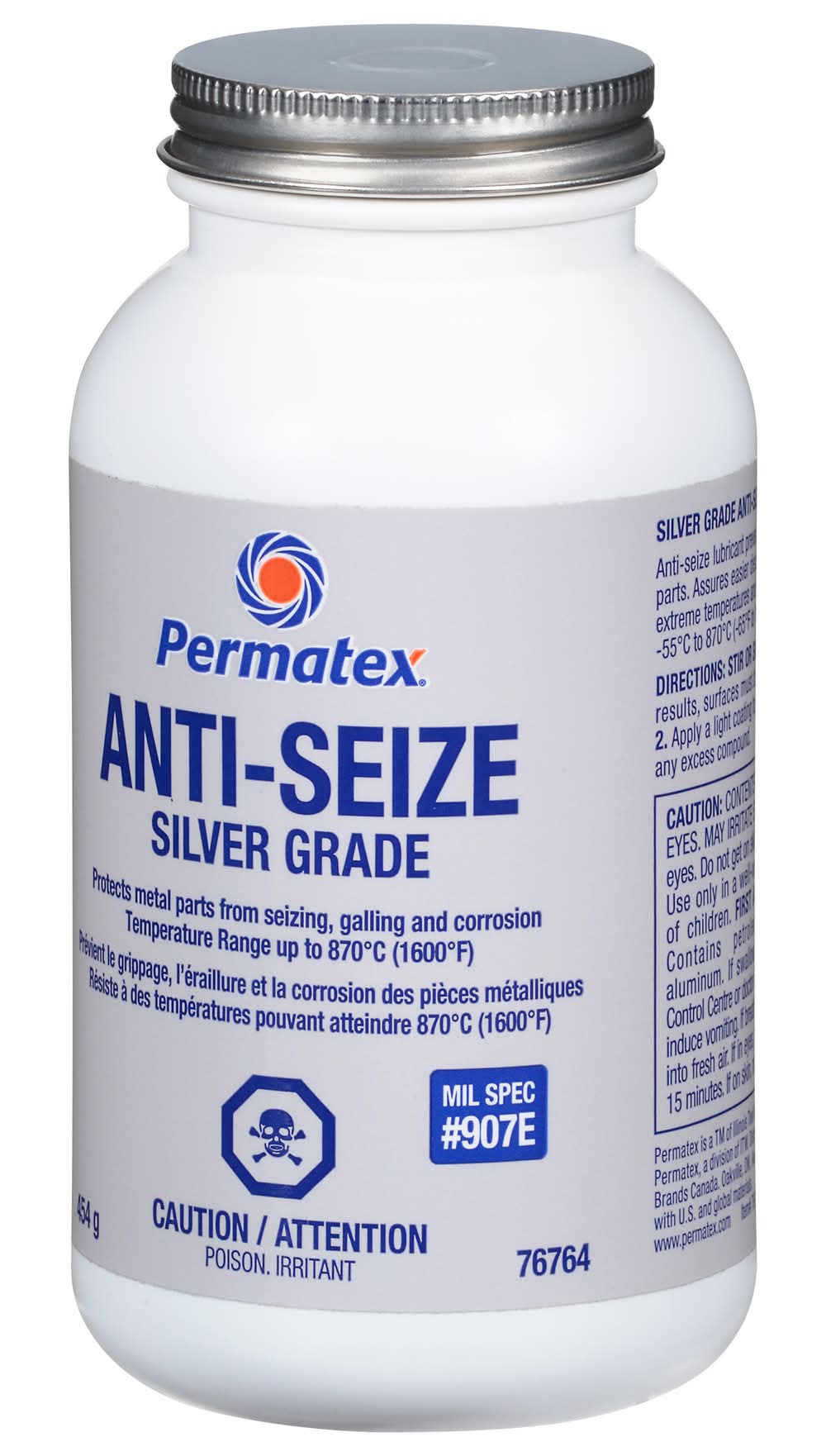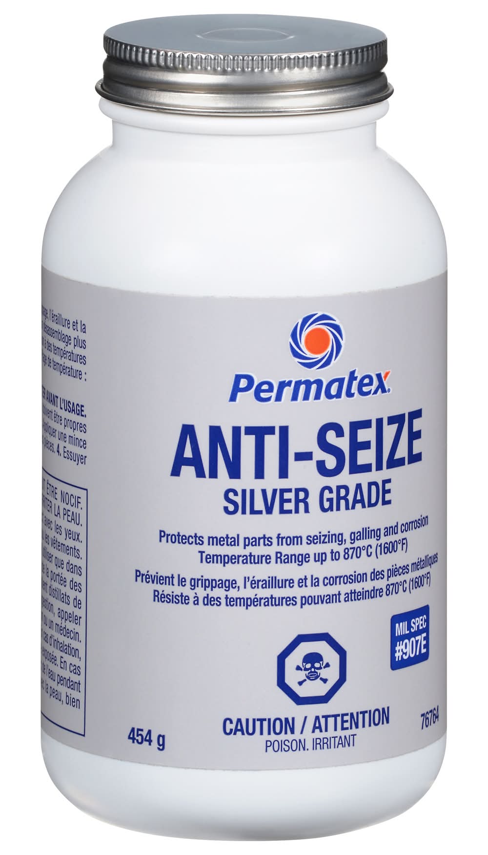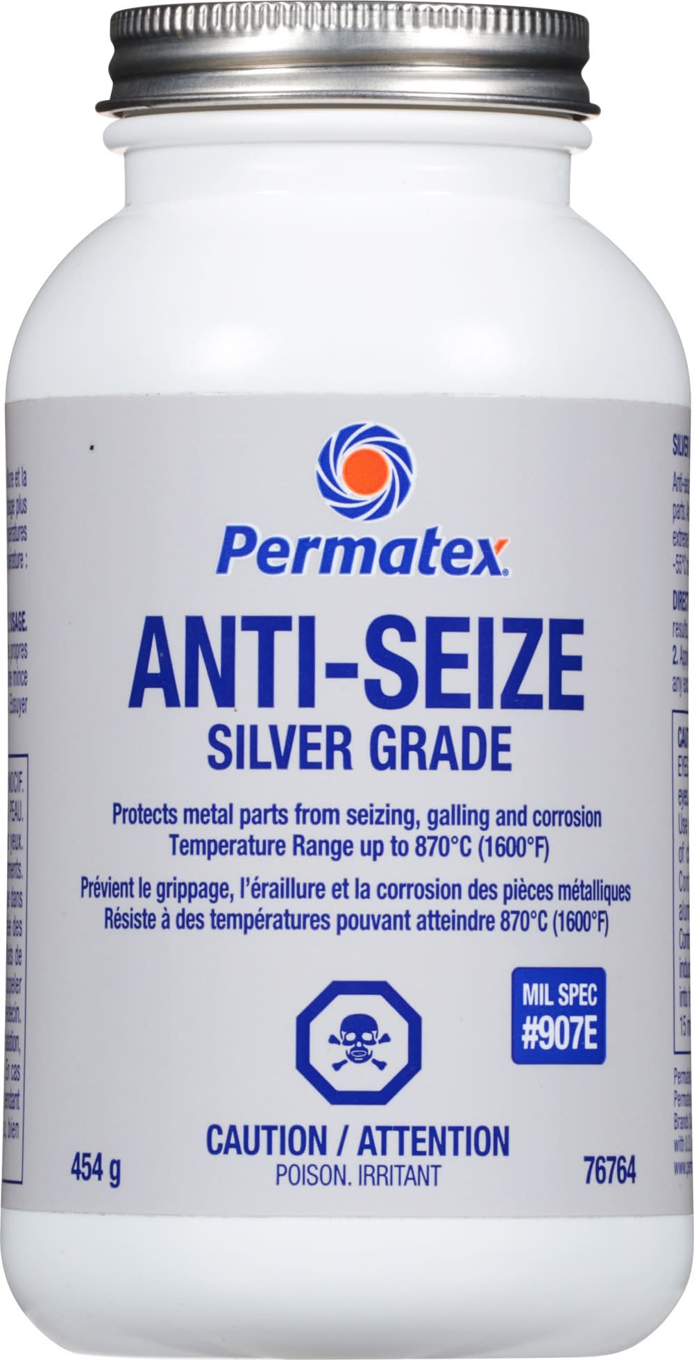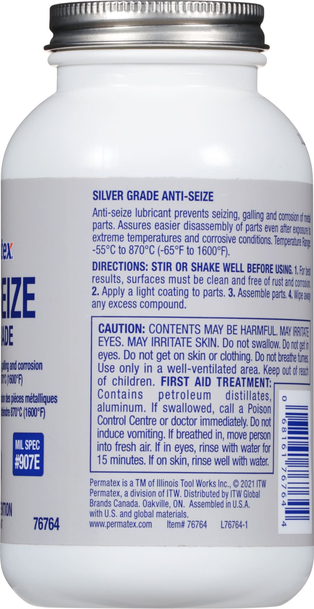 Protects metal parts from seizing, galling and corrosion. Temperature ranges up to 870 degrees C (1600 degrees F). Mil spec no. 907E. Silver Grade Anti-Seize: Anti-seize lubricant prevents seizing, galling, and corrosion of metal parts. Assures easier disassembly of parts even after exposure to extreme temperatures and corrosive conditions. Temperature Range: -55 degrees C to 870 degrees C (-65 degrees F to 1600 degrees F). www.permatex.com. Assembled in U.S.A. with U.S. and global ingredients. ITW Global Brands,