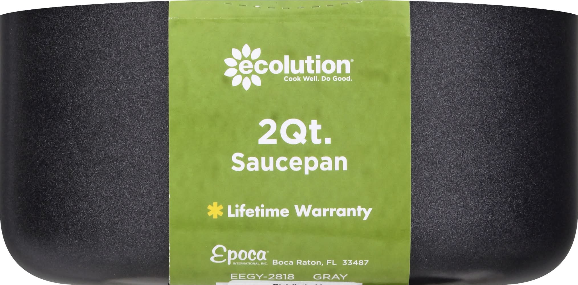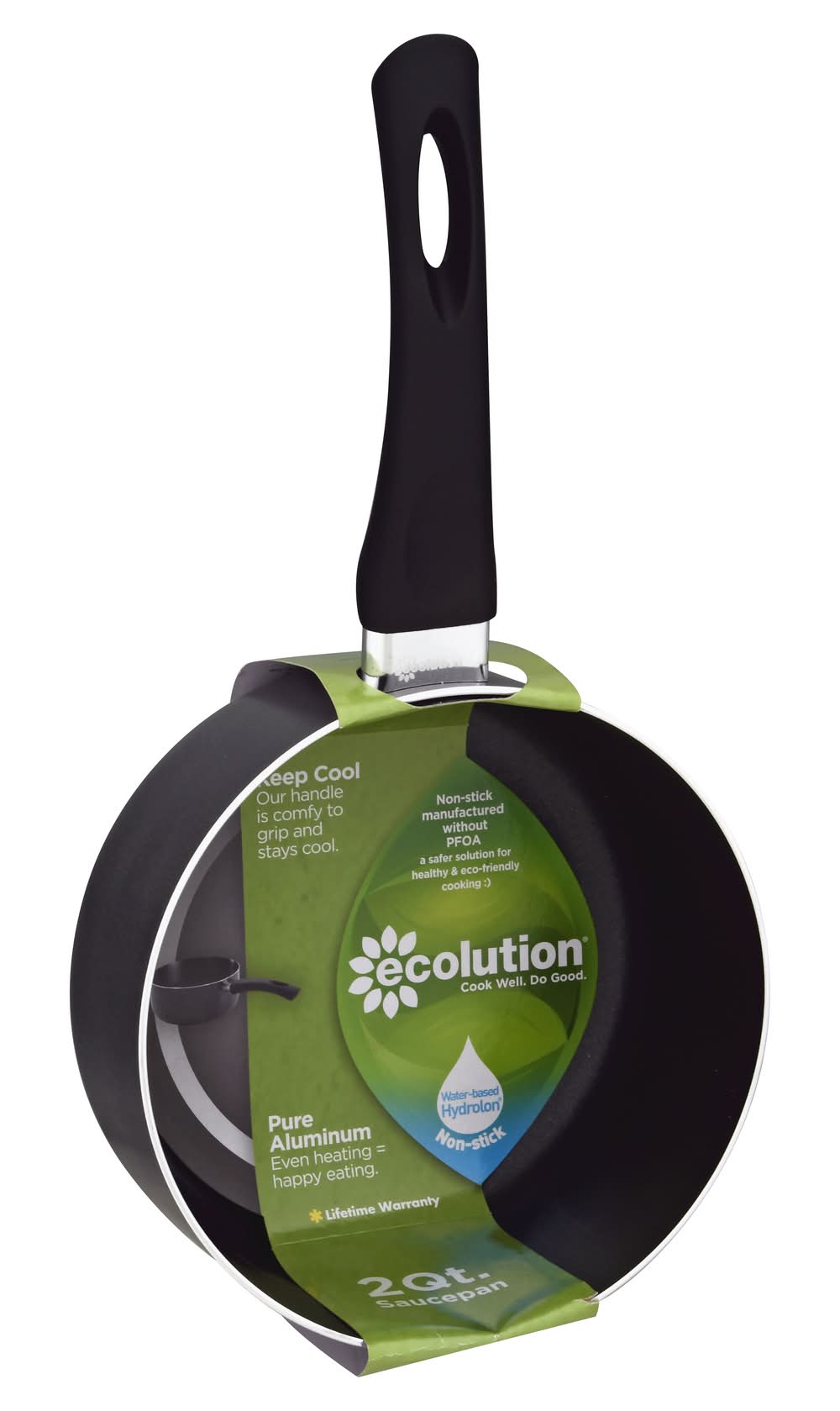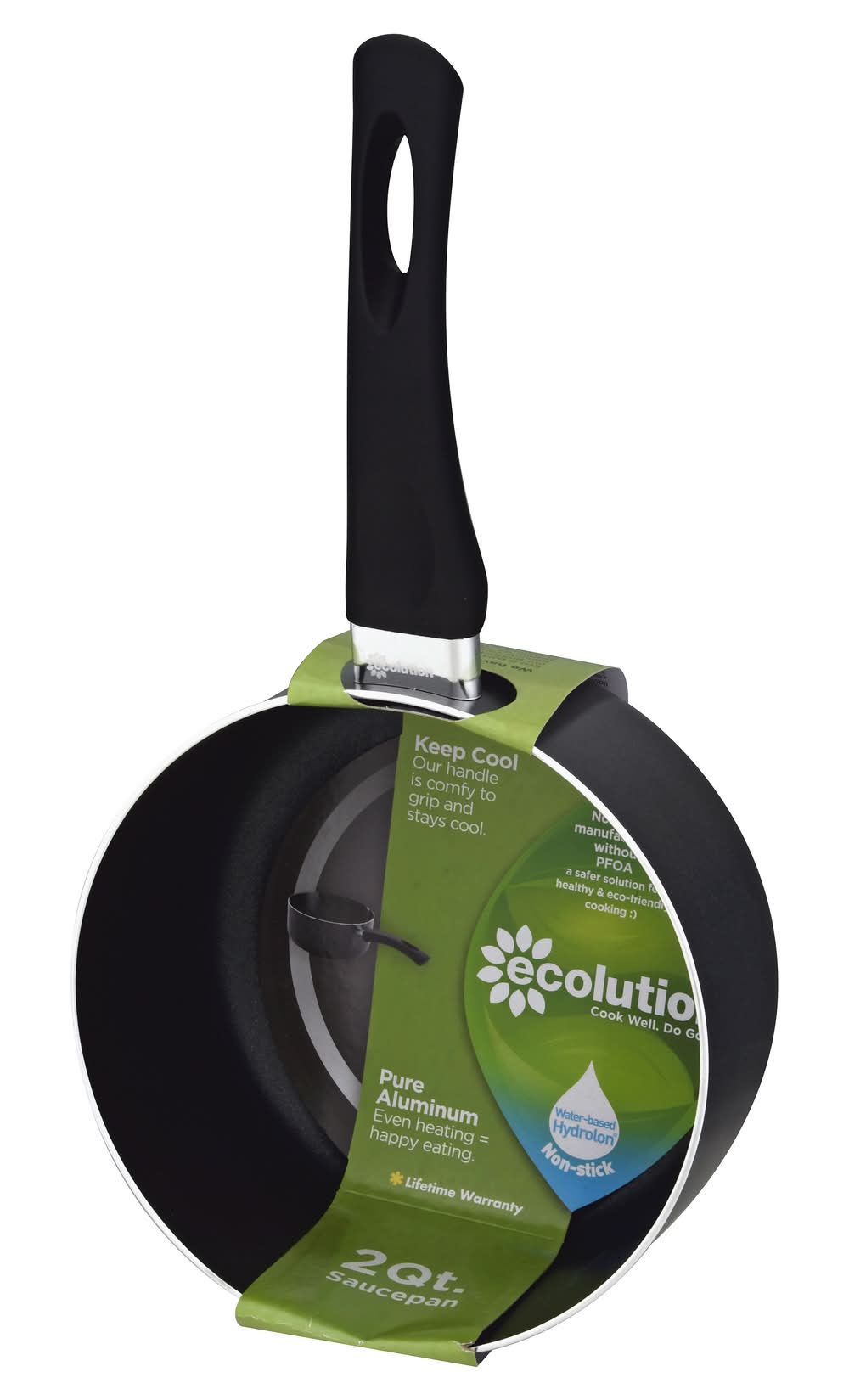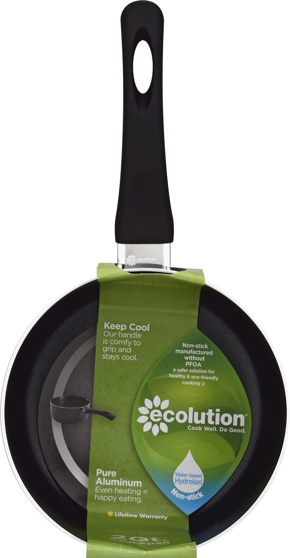 Keep cool. Our handle is comfy to grip and stays cool. Non-stick manufactured without PFOA, a safer solution for healthy & eco-friendly cooking. Cook well. Do good. Pure aluminum. Even heating = happy eating. Water-based hydrolon. We have a huge eco. Eco is part of our name and our products. If you share a genuine concern for the planet, we have something in common. We believe that cooking well in the kitchen and doing good for the planet can happen at the same time. Cool Well: Keep cool. Our handle is comfy to grip and stays cool. Even Heating = Happy Eating: Pure aluminum ensures consistent heating. Dishwasher safe. it's that easy! Do good. Hydrolon is our ecologically advanced, water-based non-stick coating. Made without PFOA means safer for you and fewer greenhouse gases. Not a flash in the pan. We have been selling cookware for generations. From our family to yours, we say cook well. Do good. Lifetime warranty. Printed on 70% recycled materials. EcolutionHome.com for info on recycling and more of the scene on green. • Winston-Salem, • Packaging: Reusable