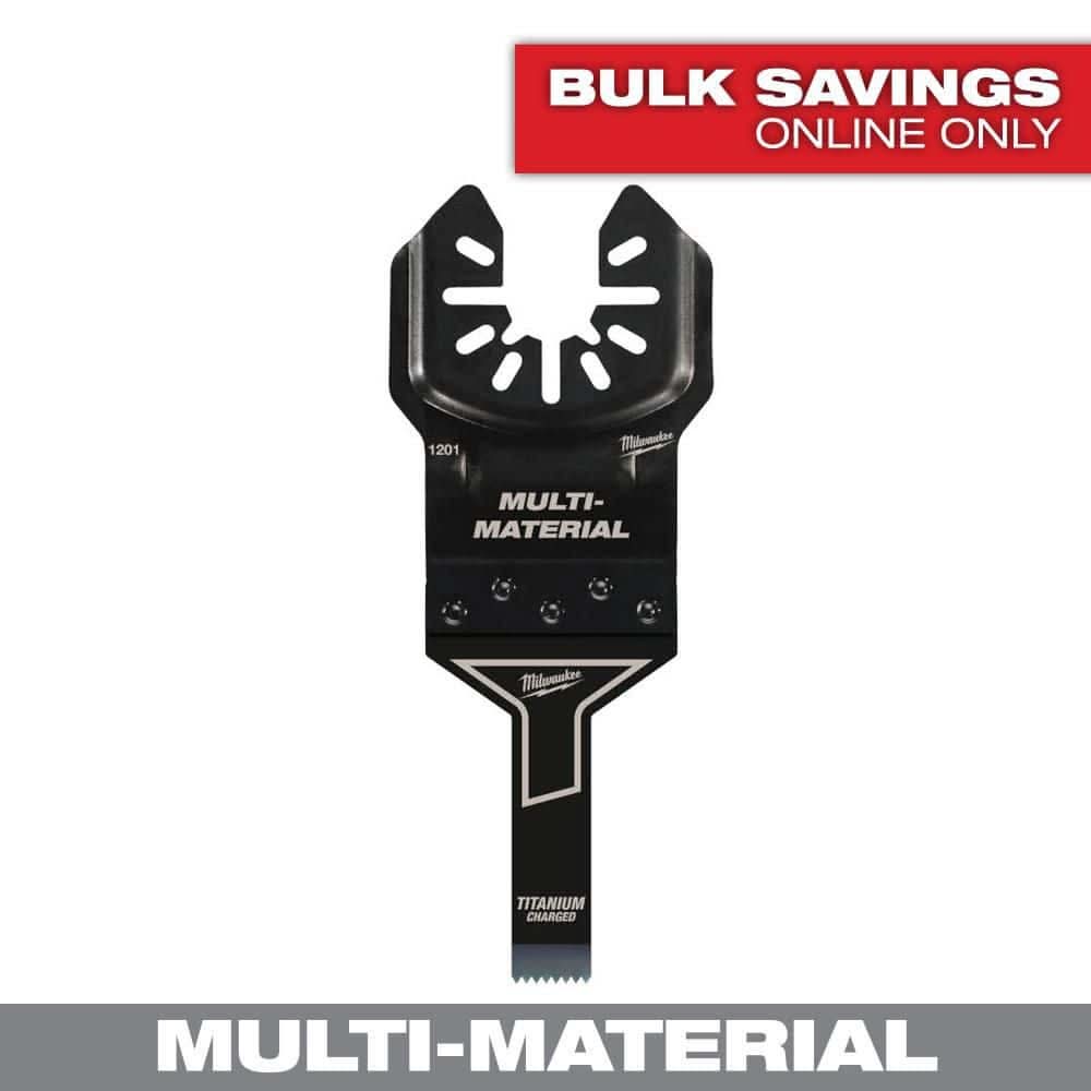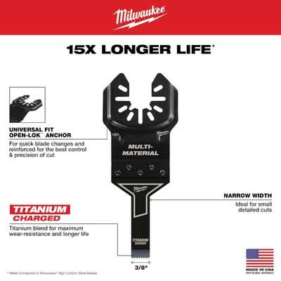 The MILWAUKEE OPEN-LOK 3/8" TITANIUM CHARGED Bi-Metal Multi-Material Oscillating Multi-Tool Blades are made from premium high-speed steel. These bi-metal blades are ideal for cuts in wood, nails, PVC, and drywall. TITANIUM CHARGED Bi-Metal blades have an optimized titanium blend for maximum wear-resistance and up to 15x longer life vs. high carbon steel (HCS) blades. These blades feature a reinforced Universal Fit OPEN-LOK anchor for better strength & control and allow for quick blade changes across 100+ multi-tools. Not compatible with Starlock tools. MILWAUKEE oscillating multi-tool blades are designed and made in the USA with global materials. Size: 3/8 inc