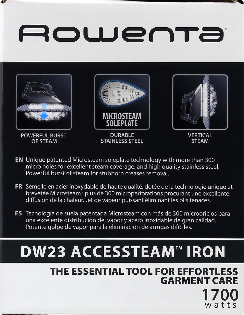 A brand born in Germany in 1909. No. 1 brand in garment care. Appliances in USA + Canada area (Source USA + Canada: The NPD Group, Inc./Retailer Tracking Service, 12 months ending December 2017, dollar sales). Powerful steam. The essential tool for effortless garment care. Powerful iron. Over 300 steam holes. Extra durability. Effortless vertical steam. Powerful burst of steam. Safety auto-off. Comfort handle. Anti-calc system. Easy refill. Durable soleplate. Excellent steam coverage. Precision tip. Precise spray. Microsteam soleplate. Durable stainless steel. Vertical steam. Unique patented Microsteam Soleplate Technology with more than 300 micro holes for excellent steam coverage, and high quality stainless steel. Powerful bust steam for stubborn creases removal. 120V - 1700W. 60 Hz. For household use only. UL listed. Made in China.