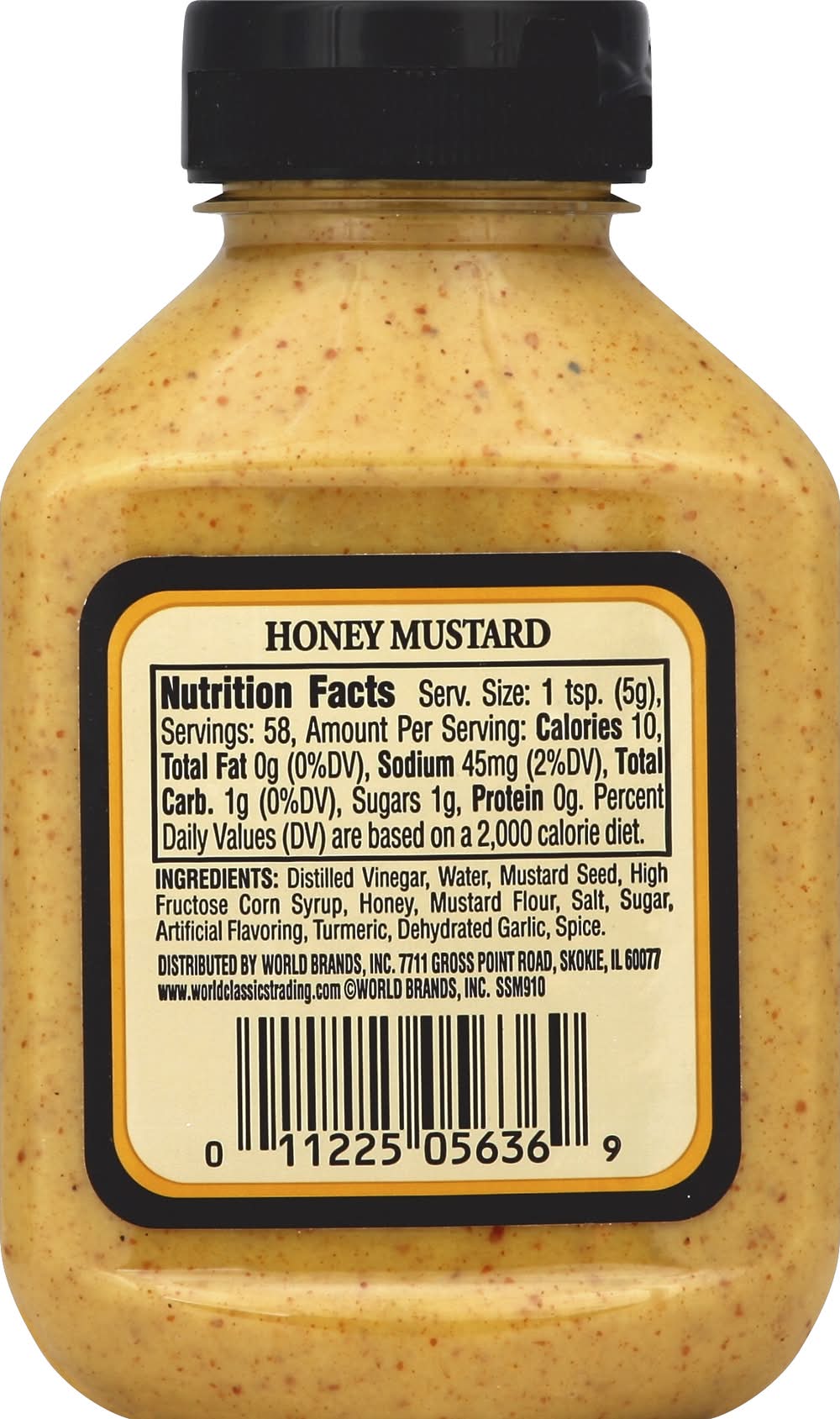 Distilled Vinegar, Water, Mustard Seed, High Fructose Corn Syrup, Honey, Mustard Flour, Salt, Sugar, Artificial Flavoring, Turmeric, Dehydrated Garlic, Spice