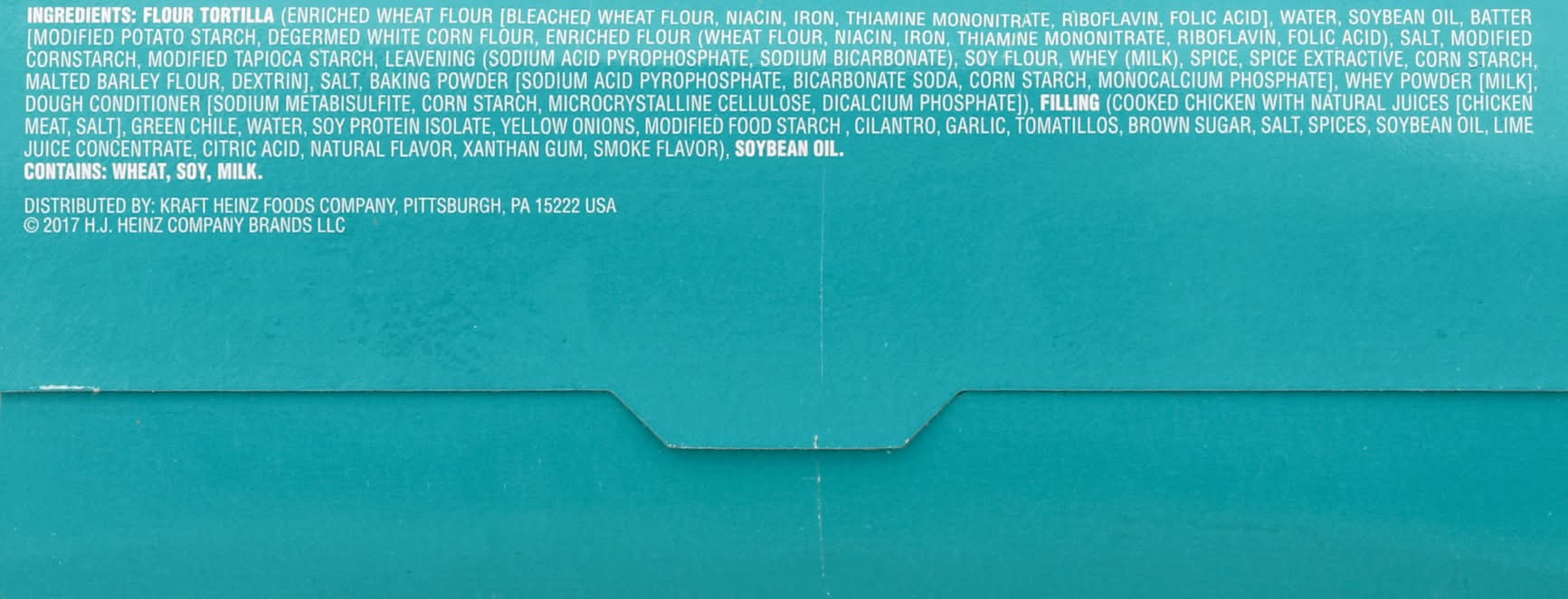 Flour Tortilla (Enriched Wheat Flour (Bleached Wheat Flour Niacin Iron Thiamine Mononitrate Riboflavin Folic Acid), Water, Soybean Oil, Batter [Modified Potato Starch, Degermed White Corn Flour, Enriched Flour (Wheat Flour Niacin Iron Thiamine Mononitrate Riboflavin Folic Acid), Salt, Modified Cornstarch, Modified Tapioca Starch, Leavening (Sodium Acid Pyrophosphate Sodium Bicarbonate), Soy Flour, Whey (Milk), Spice, Spice Extractive, Corn Starch, Malted Barley Flour, Dextrin], Salt, Baking Powder [Sodium Acid Pyrophosphate, Bicarbonate Soda, Corn Starch, Monocalcium Phosphate], Whey Powder [Milk], Dough Conditioner [Sodium Metabisulfite, Corn Starch, Microcrystalline Cellulose, Dicalcium Phosphate]), Filling (Cooked Chicken with Natural Juices [Chicken Meat Salt] Green Chile Peppers [Chile Peppers Citric Acid] Water Soy Protein Isolate Yellow Onions Cilantro Modified Corn Starch Modified Food Starch Garlic Crushed Tomatillos [Tomatillos Citric Acid] Brown Sugar Salt Spices Soybean Oil Flavor Blend [Flavor (Contains Celery Seed Oil), Extractives of Chili Pepper, Smoke Flavor], Lime Juice Concentrate, Xanthan Gum), Soybean Oil Contains: Milk, Soybeans, Wheat