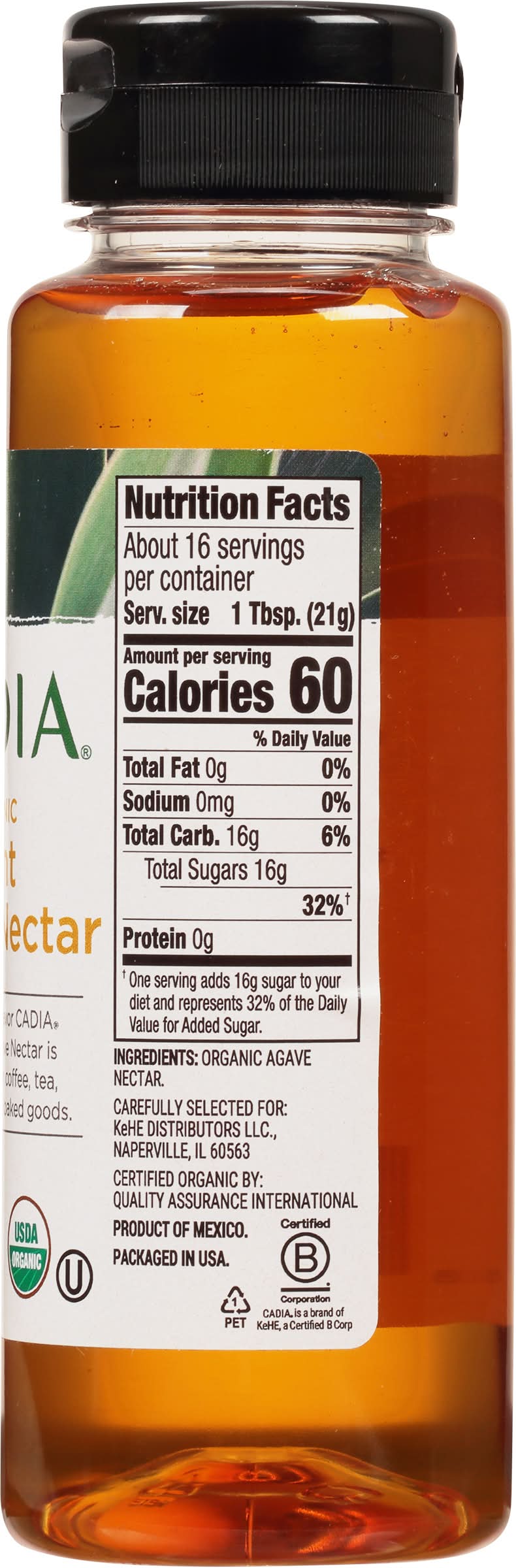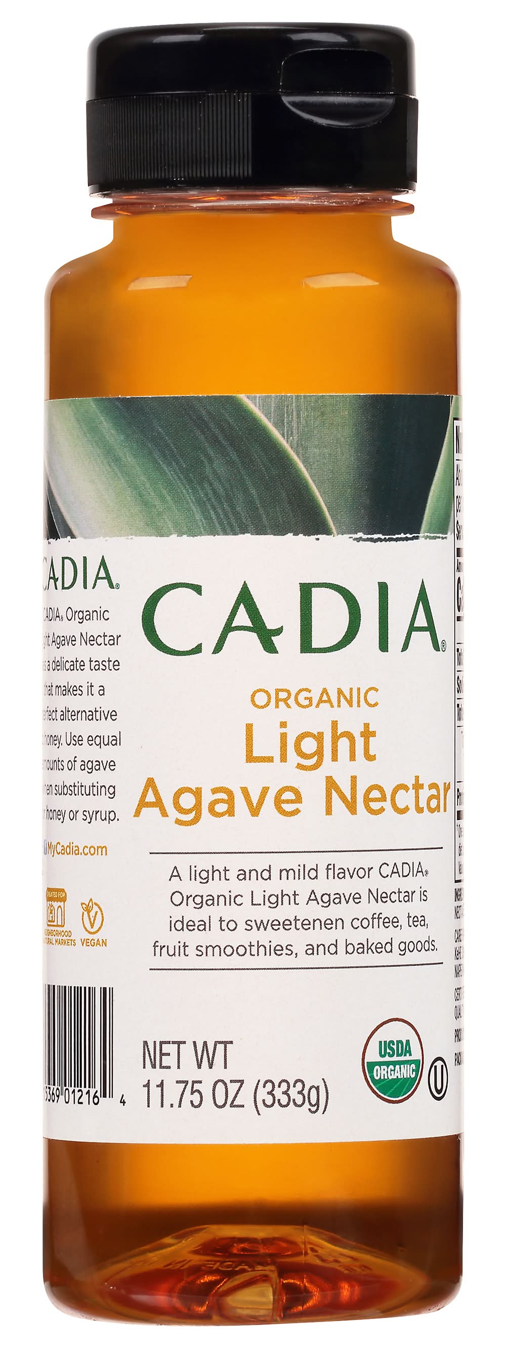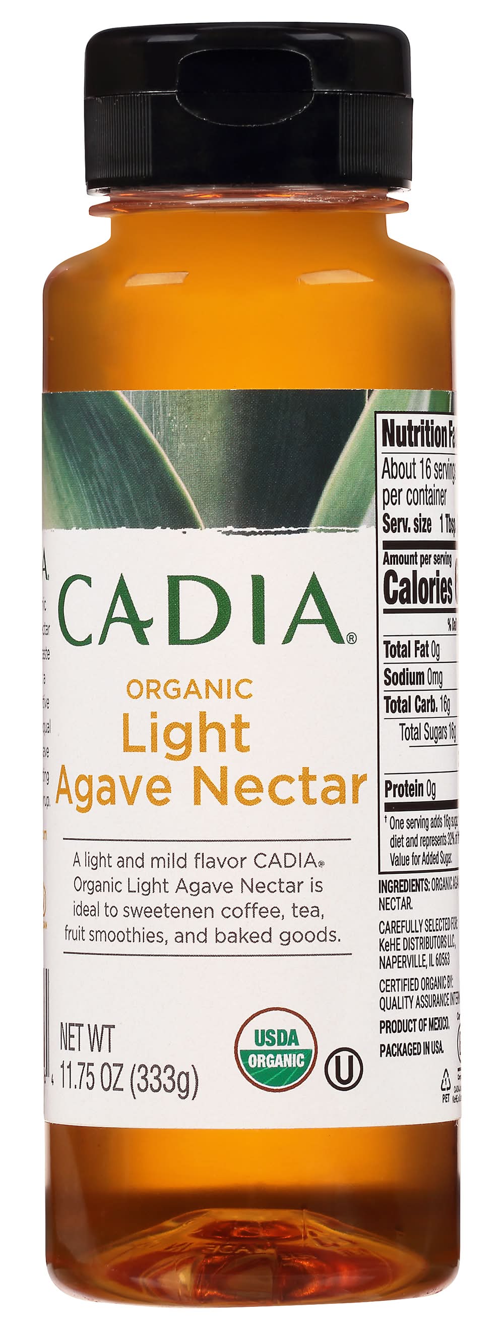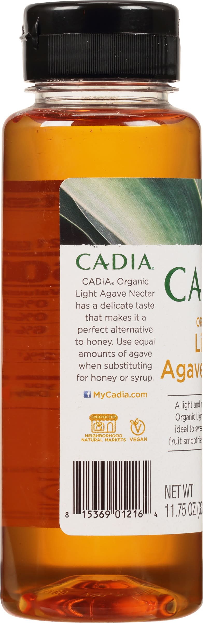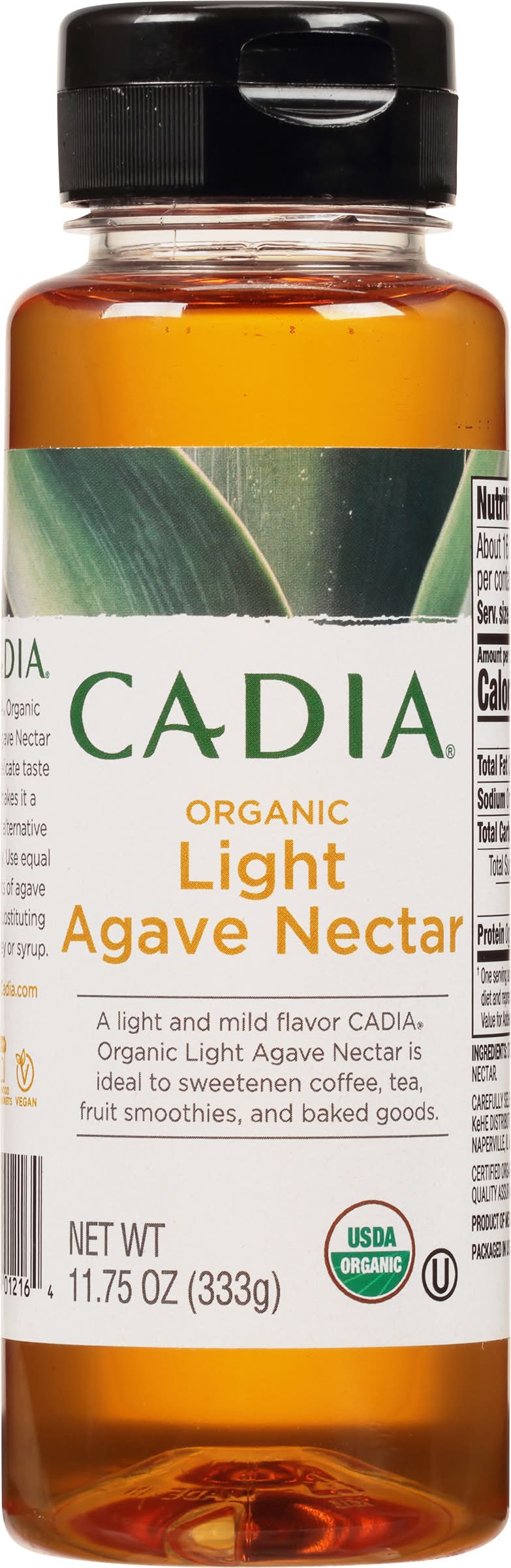 A light and mild flavor Cadia Organic Light Agave Nectar is ideal to sweetenen coffee, tea, fruit smoothies, and baked goods. USDA Organic. Vegan. Certified Organic by: Quality assurance international. Cadia Organic Light Agave Nectar has a delicate taste that makes it a perfect alternative to honey. Use equal amounts of agave when substituting for honey or syrup. MyCadia.com. Facebook. Certified B Corporation. Cadia is a brand of KeHE, a Certified B Corp. Created for neighborhood natural markets. Product of Mexico. Packaged in USA. KeHE Distributors LLC.,