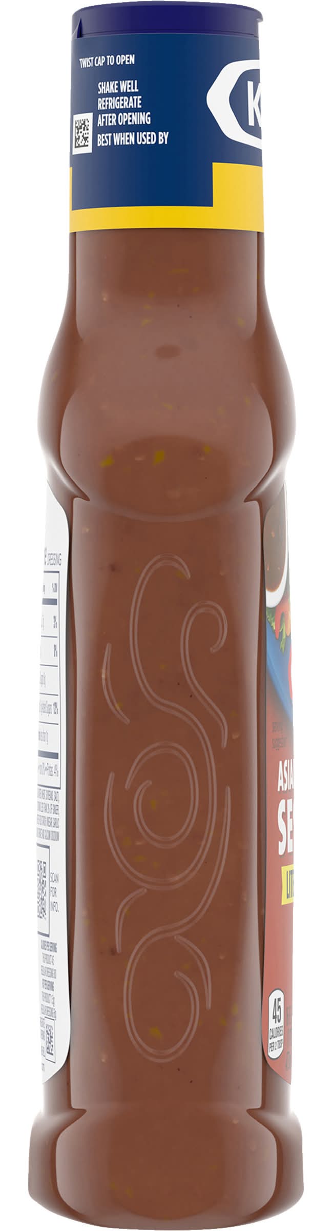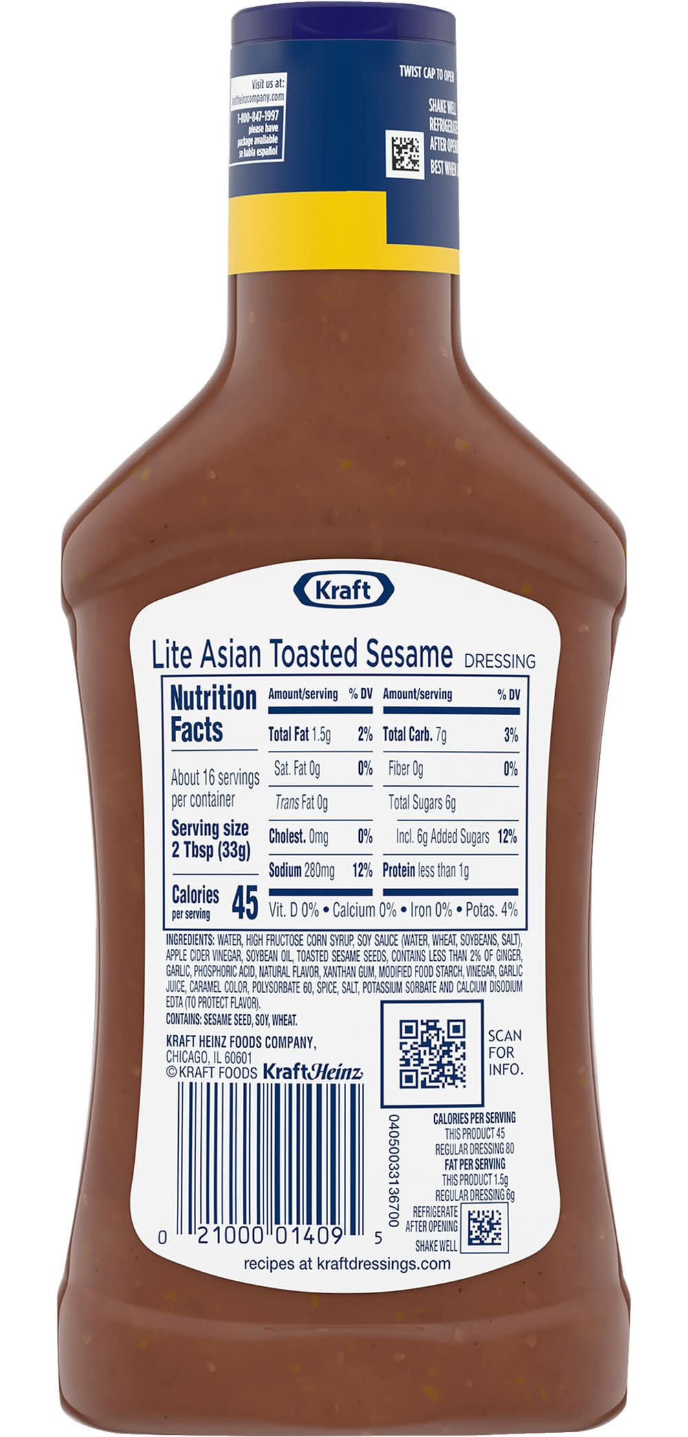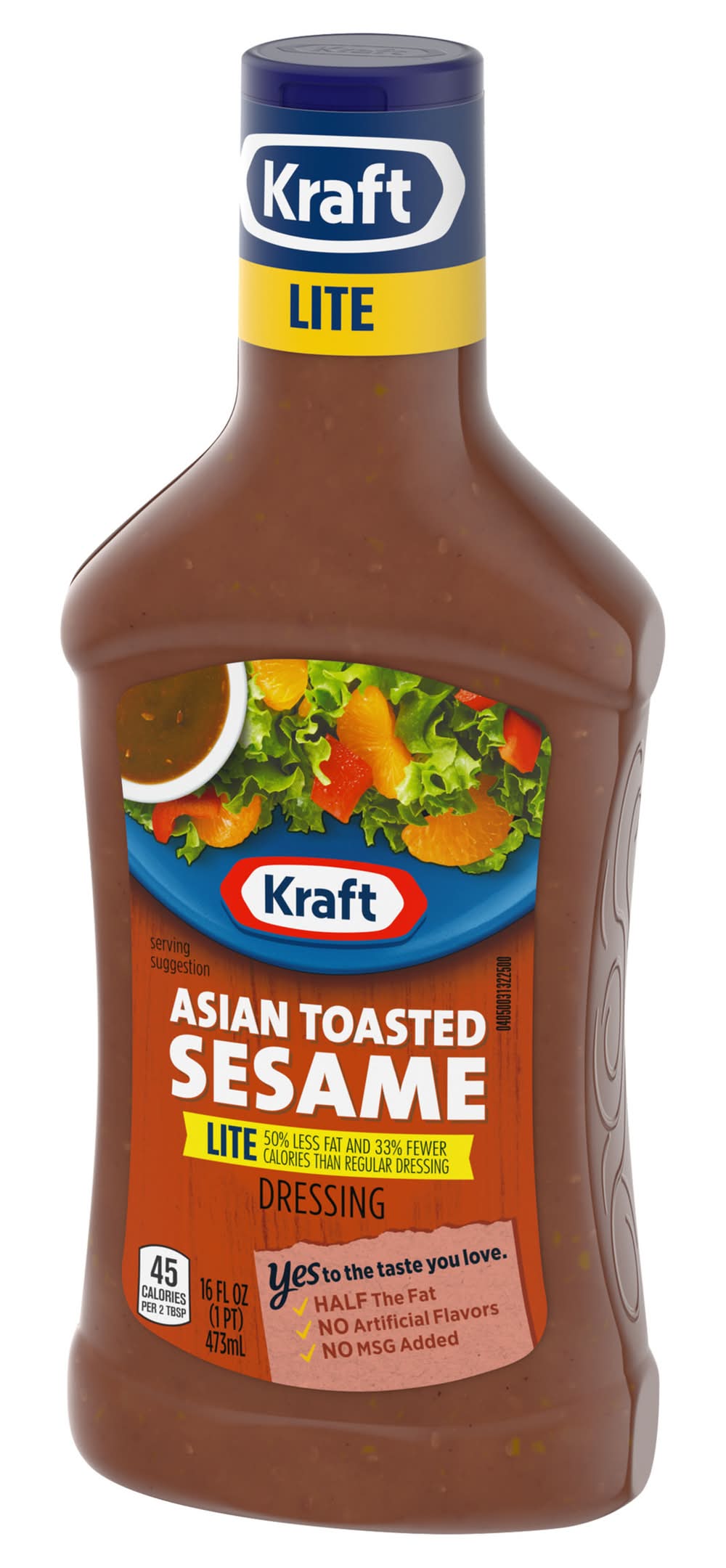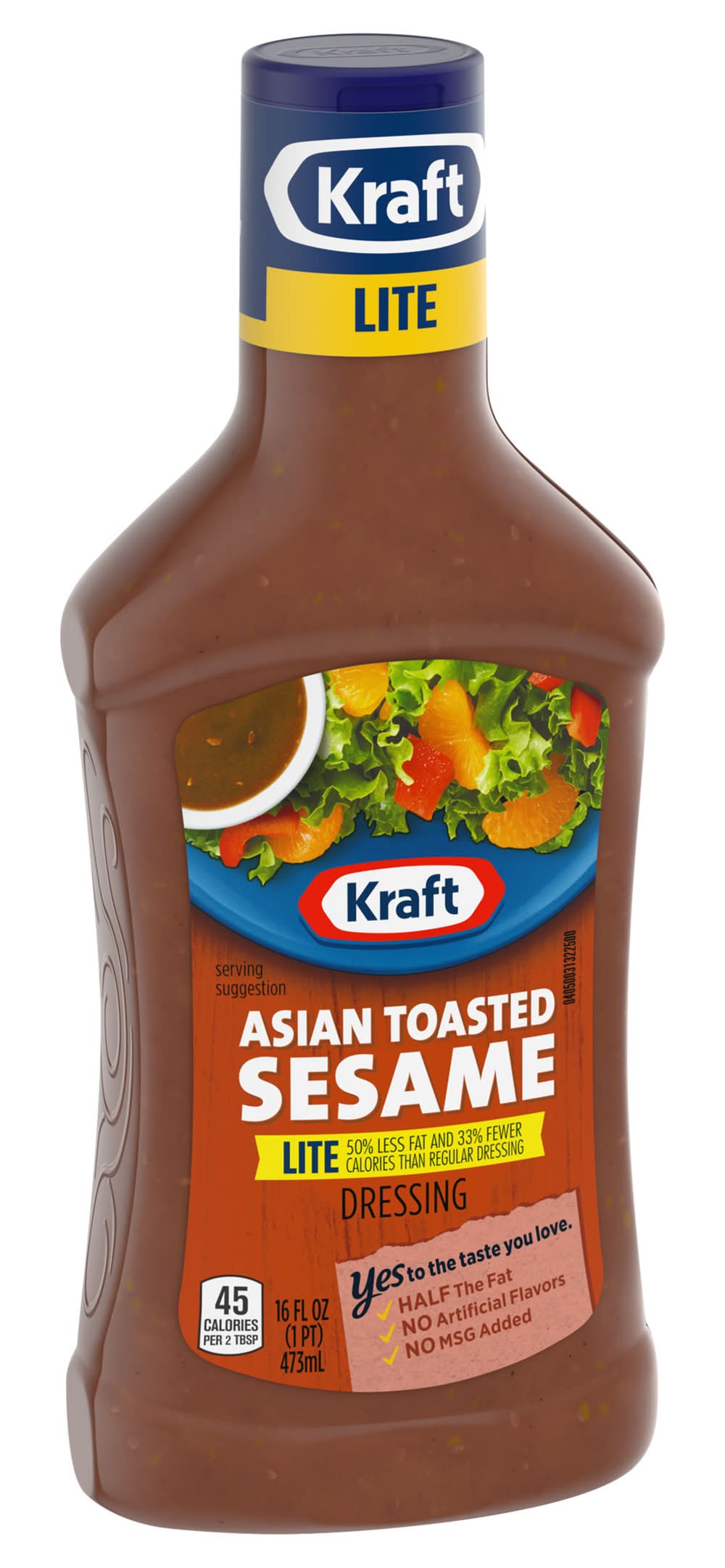 Kraft Asian Toasted Sesame Lite Dressing adds robust flavor to almost anything. Bursting with soy sauce, toasted sesame seeds, apple cider vinegar and some ginger and garlic, our family favorite Asian dressing delivers bold flavor in every bite. Pre-mixed for convenience, our bottled dressing is ready to enjoy after a quick shake. With half the fat of regular dressing, no artificial flavors, no added MSG and 45 calories per serving, you'll feel good about adding our delicious Asian sesame dressing for salad to all your favorite appetizers and entrees. Try our light Asian dressing on salads and sandwiches, or use it as a unique chicken marinade or dipping sauce. Our light dressing is packaged in a 16 fluid ounce dressing bottle with a convenient applicator top so you can add the perfect amount to all your favorite dishes. • Number of servings: 16 • Kraft Heinz Foods Company, Chicago, IL, 60601 • Packaging: Reusable
