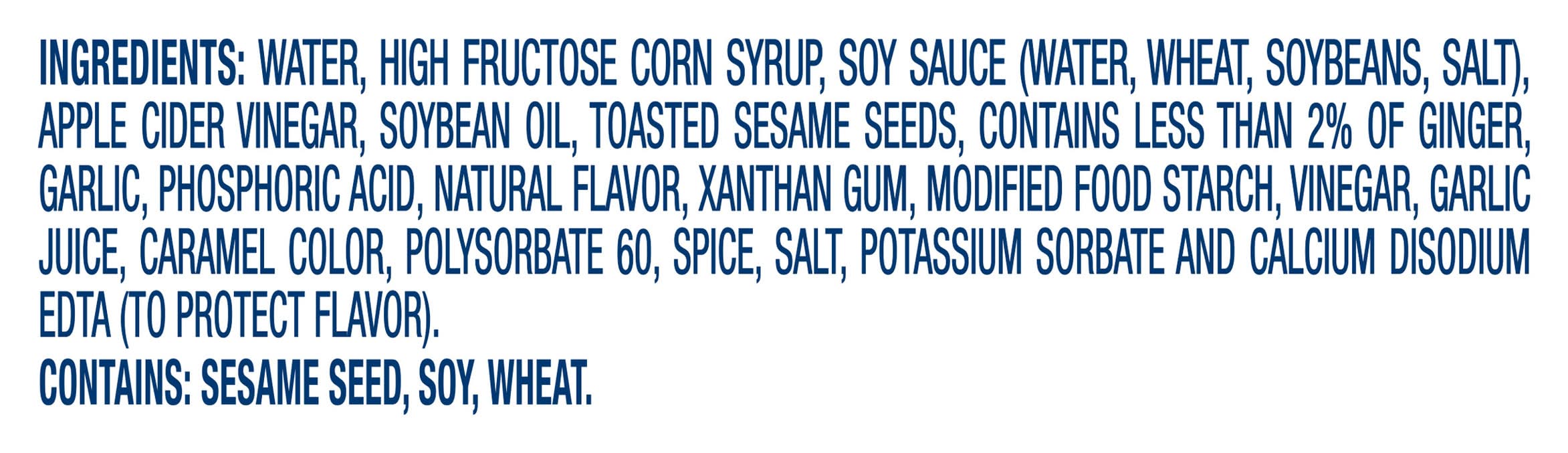 Ingredients: WATER, HIGH FRUCTOSE CORN SYRUP, SOY SAUCE (WATER, WHEAT, SOYBEANS, SALT), APPLE CIDER VINEGAR, SOYBEAN OIL, TOASTED SESAME SEEDS, CONTAINS LESS THAN 2% OF GINGER, GARLIC, PHOSPHORIC ACID, NATURAL FLAVOR, XANTHAN GUM, MODIFIED FOOD STARCH, VINEGAR, GARLIC JUICE, CARAMEL COLOR, POLYSORBATE 60, SPICE, SALT, POTASSIUM SORBATE AND CALCIUM DISODIUM EDTA (TO PROTECT FLAVOR), . Contains: CONTAINS: SESAME SEED, SOY, WHEAT.