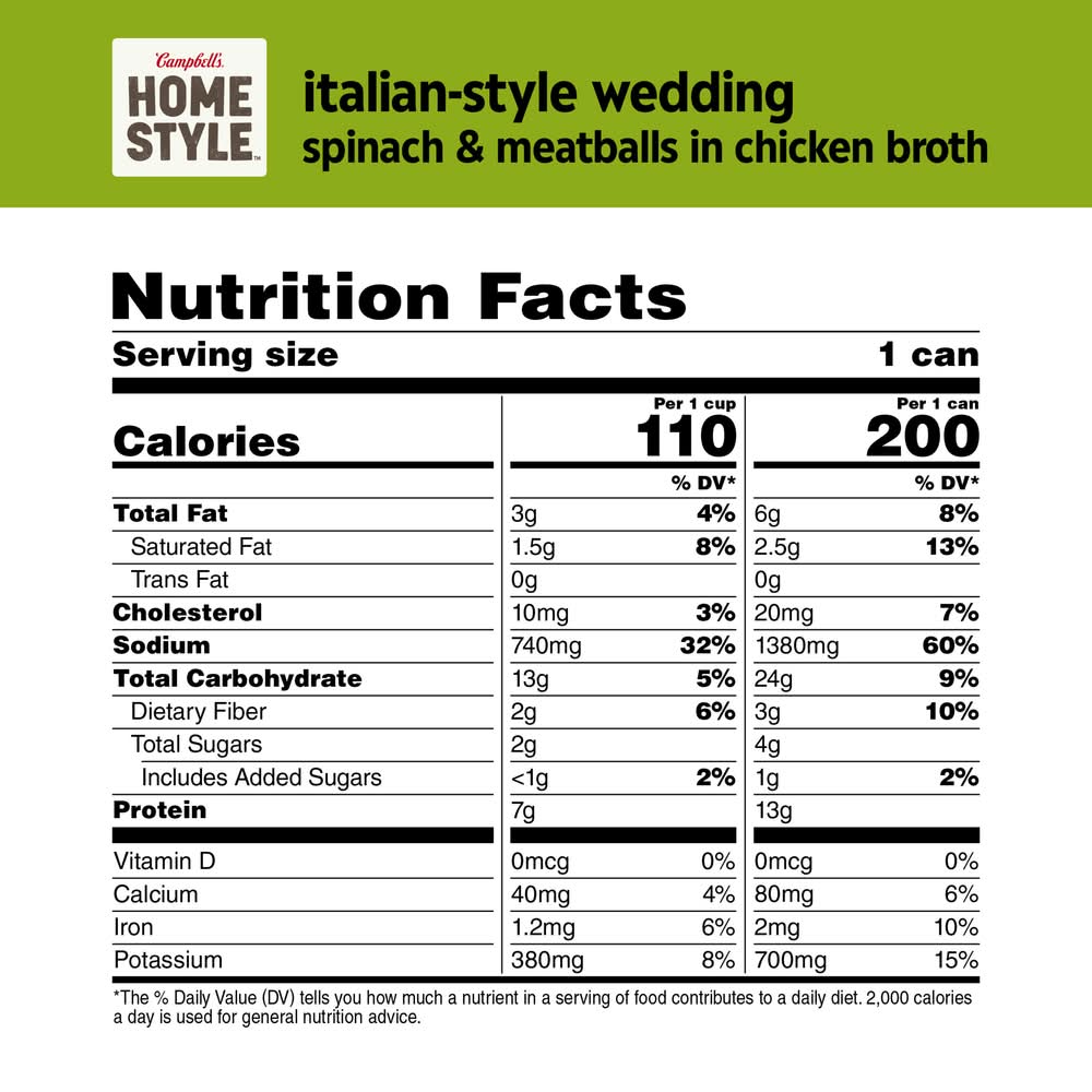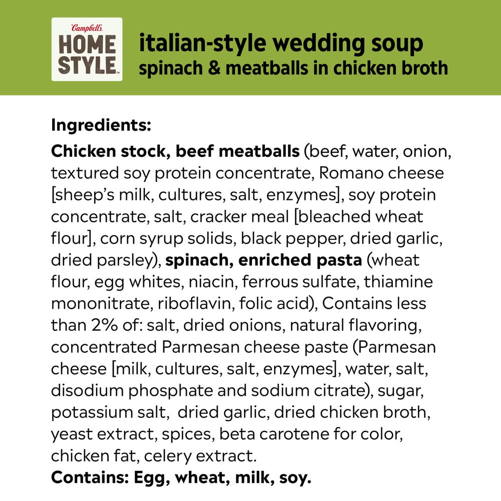 Enjoy the familiar tastes of home with every spoonful of Campbell's Homestyle Italian Wedding Soup. Made with meatballs, spinach, romano cheese and pasta in chicken broth, our hearty Italian-Style Wedding Soup is crafted with care to deliver a delicious homemade taste that’s sure to warm your heart. Top it with grated Parmesan and a pinch of red pepper flakes, or pair it with a sandwich or salad for something quick and easy. No matter the season, this convenient canned soup is a must-have pantry staple and comfort food that adds a satisfying warmth to any day. To prepare in the microwave, heat the microwave soup in a covered microwave-safe bowl for 2 to 2.5 minutes or until hot. Alternatively, you can heat it in a saucepan on the stove, stirring occasionally. Each 16.1 oz recyclable can contains 1 serving of soup and features an easy-open pop top and a non-BPA lining. Enjoy a comforting moment with a warm bowl of familiar, homemade flavors. Campbell’s Homestyle: The Taste That Takes You Home. Flavor: Chicken
