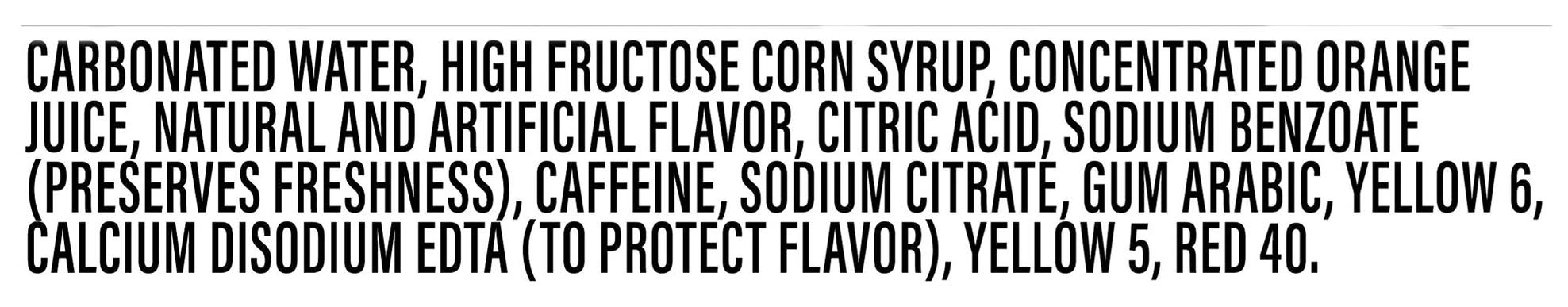 Ingredients: CARBONATED WATER, HIGH FRUCTOSE CORN SYRUP, CONCENTRATED ORANGE JUICE, NATURAL AND ARTIFICIAL FLAVOR, CITRIC ACID, SODIUM BENZOATE (PRESERVES FRESHNESS), CAFFEINE, SODIUM CITRATE, GUM ARABIC, YELLOW 6, CALCIUM DISODIUM EDTA (TO PROTECT FLAVOR), YELLOW 5, RED 40.