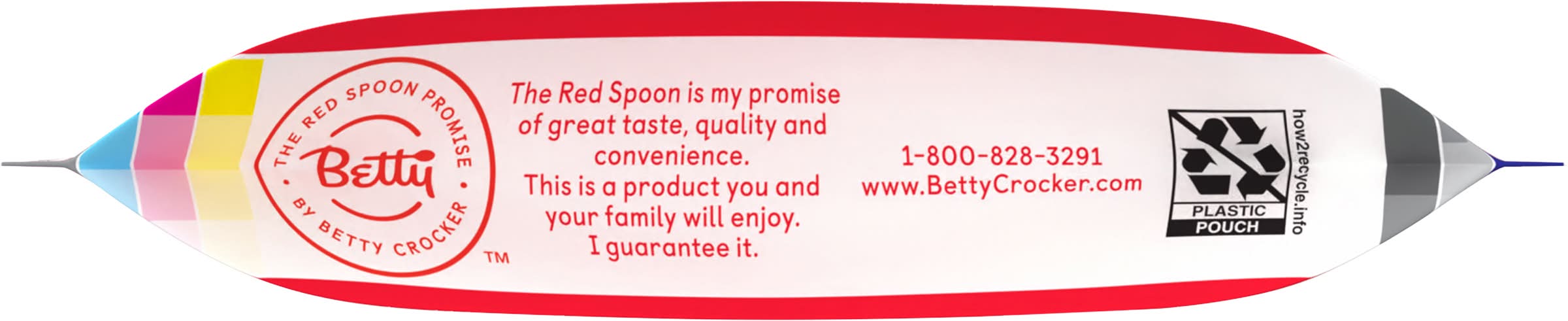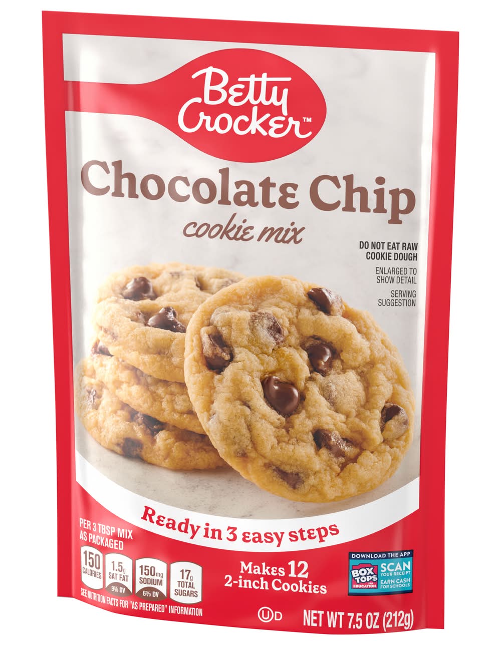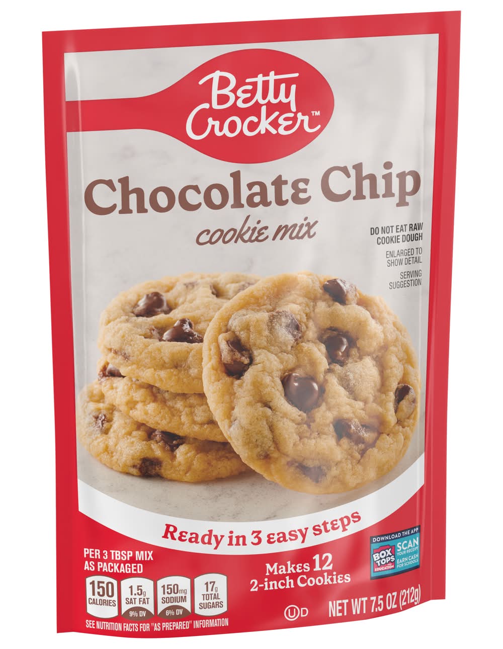 Per 3 Tbsp Mix as Packaged: 150 calories; 1.5 g sat fat (9% DV); 150 mg sodium (6% DV); 17 g total sugars. See nutrition facts for as prepared information. Ingredients derived from a bioengineered source. Learn more at Ask.GeneralMills.com. Ready in 3 easy steps. Makes 12 2-inch cookies. This package is sold by weight, not by volume. You can be assured of proper weight even though some settling of contents normally occurs during shipment and handling. The Red Spoon Promise: The Red Spoon is my promise of great taste, quality and convenience. This is a product you and your family will enjoy. I guarantee it. 1-800-446-1898; www.BettyCrocker.com. Ask.GeneralMills.com. how2recycle.info. www.BettyCrocker.com. Instagram: Follow us for more! (at)bettycrocker. Box Tops for Education: No more clipping. Scan your receipt. See how at BTFE.com. • Size: 7.5 OZ • General Mills Sales, Inc., Minneapolis, MN, 55440 • Packaging: Reusable