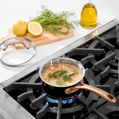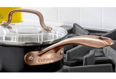 Perfect for preparing soups, vegetables, sauces and delicious side dishes. Professional stainless steel offers optimal cooking performance. Powerbond high impact bonded base for even heating. Comfortable blush bronze stainless steel Cool Grip stick handle is contoured for a secure grip and designed to stay cool on the stovetop. Rim of cookware is tapered to make pouring clean and easy. Glass lid fits tight to lock in flavor, texture, and nutrients. Oven safe to 500˚F. Glass lid is oven safe to 450˚F. Cook on stovetop, in oven, or under broiler. Interior measurement markings for easy convenience. Freezer safe for easy food storage. Dishwasher Safe. Lifetime Warranty. From our state-of-the-art kitchen products to the moments and meals you create with them — when you bring more joy to the heart of your home, everything’s A Work of Cuisinart. Sauce pan with cover Blush Bronze Handle