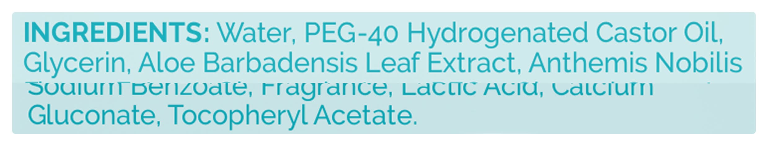 Water, PEG-40 Hydrogenated Castor Oil, Glycerin, Aloe Barbadensis Leaf Extract, Anthemis Nobilis, Sodium Benzoate, Fragrance, Lactic Acid, Calcium, Gluconate, Tocopheryl Acetate