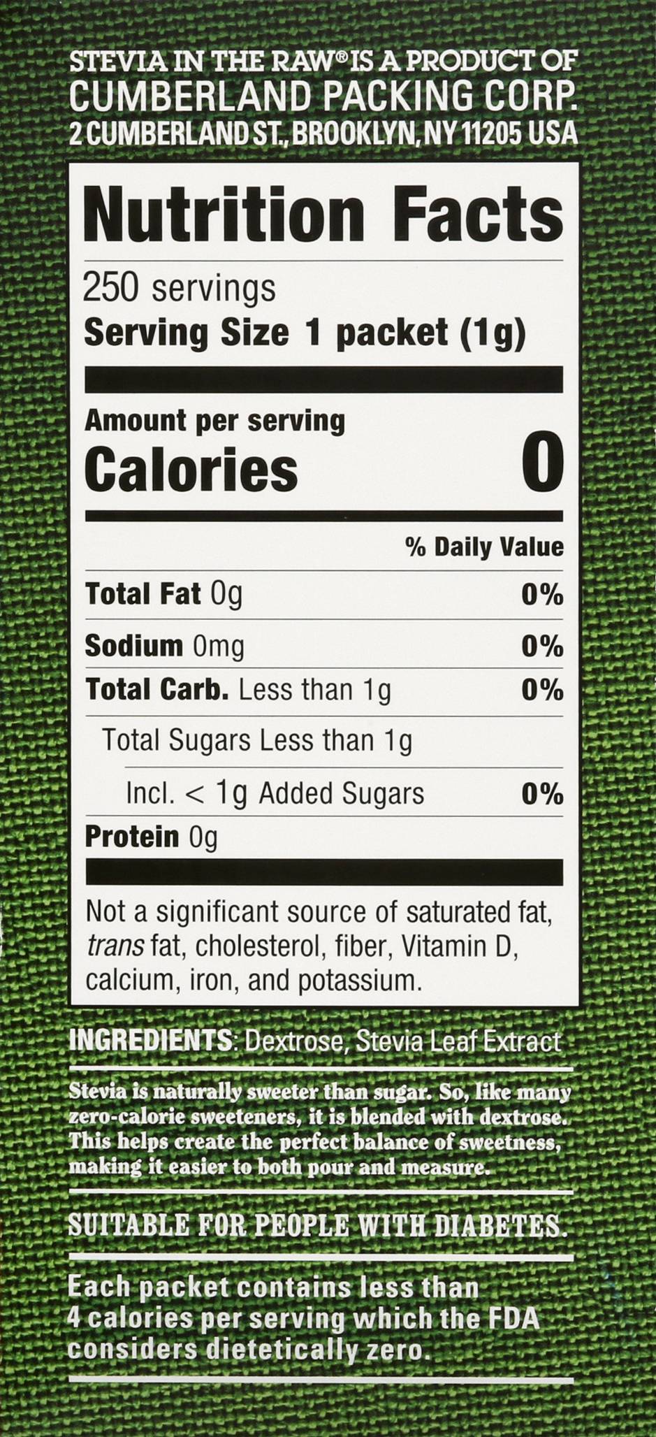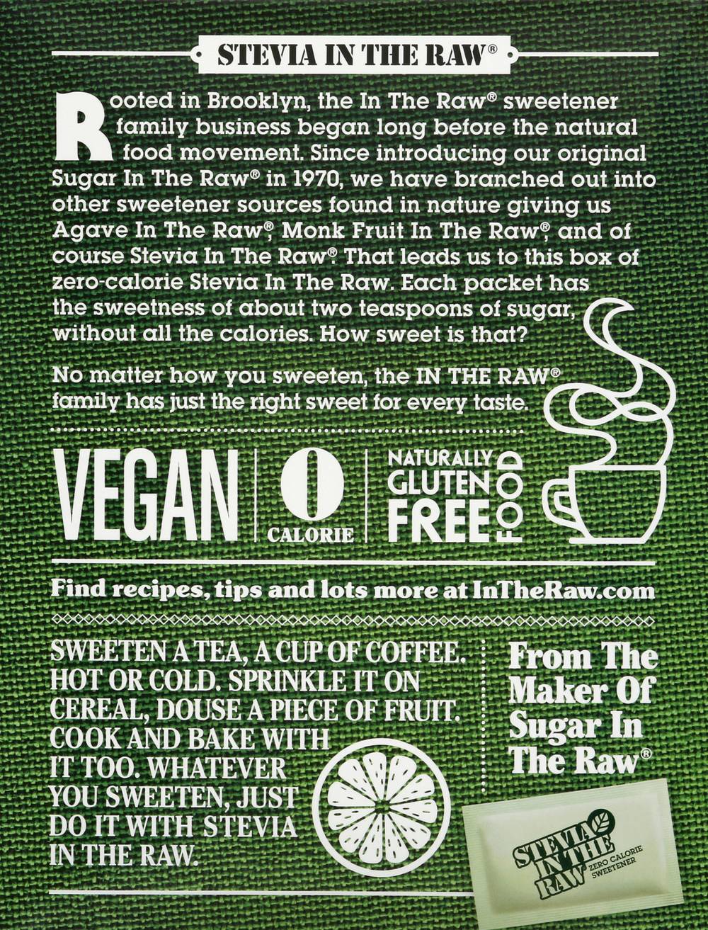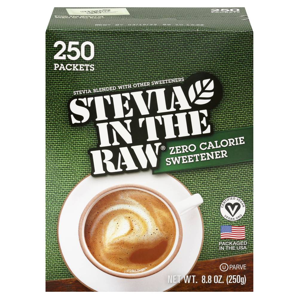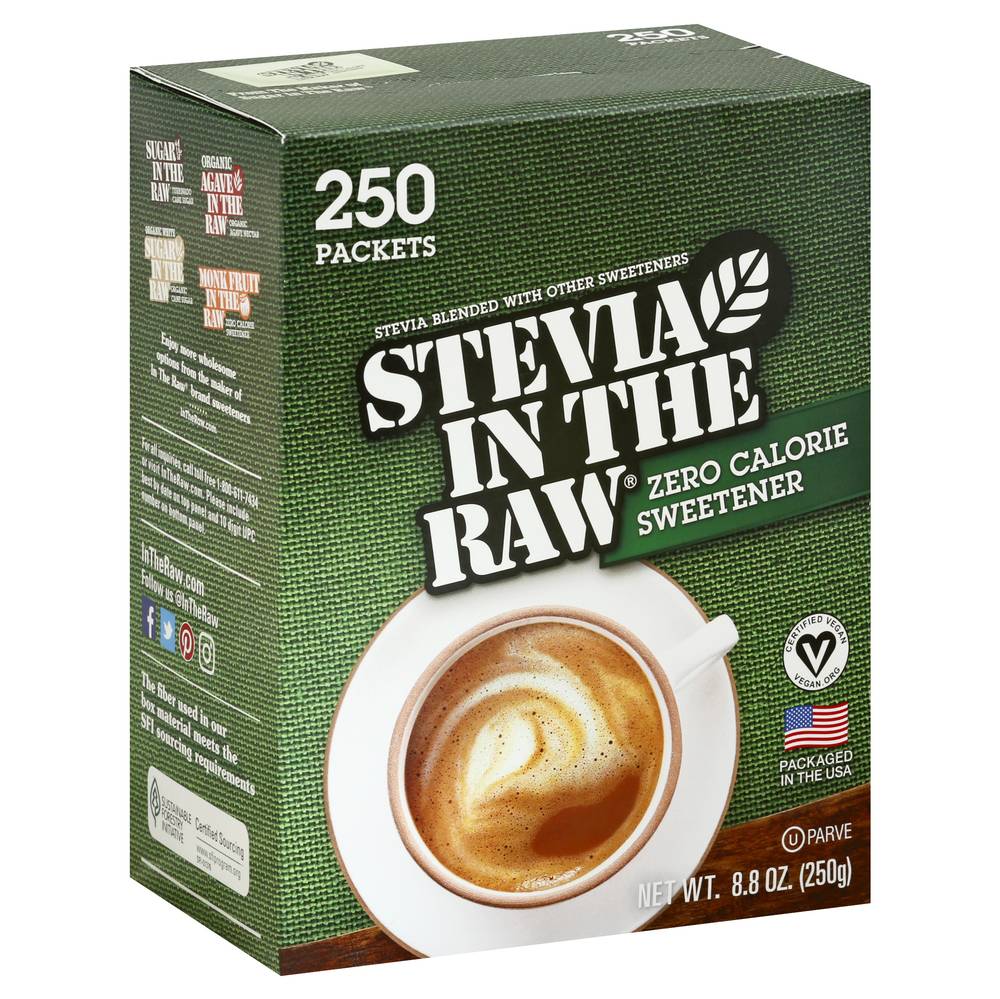 Stevia blended with other sweeteners. Certified Vegan. vegan.org. Vegan. 0 calorie. Naturally gluten free food. From the maker of sugar in the raw. Stevia in the Raw: Rooted in Brooklyn, the In The Raw sweetener family business began long before the natural food movement. Since introducing our original Sugar In The Raw in 1970, we have branched out into other sweetener sources found in nature giving us Agave In The Raw, Monk Fruit In The Raw, and a course Stevia In The Raw. That leads us to this box of zero-calorie Stevia In The Raw. Each packets has the sweetness of about two teaspoons of sugar, without all the calories. How sweet is that? No matter how you sweeten, the In The Raw family has just the right sweet for every taste. From the maker of sugar in the raw. Stevia is naturally sweeter than sugar. So, like many zero-calorie sweeteners, it is blended with dextrose. This helps create the perfect balance of sweetness, making it easier to both pour and measure. Each packet contains less than 4 calories per serving which the FDA considers dietetically zero. Sustainable Forestry Initiative: Certified sourcing. www.sfiprogram.org. Find recipes, tips and lots more at InTheRaw.com. Sugar In The Raw. Organic Agave In The Raw. Sugar In The Raw. Monk Fruit In The Raw. Enjoy more wholesome options from the maker of In The Raw brand sweeteners. InTheRaw.com. For all inquiries, call toll free 1-800-611-7434 or visit InTheRaw.com. Please include best by date on top panel and 10 digit UPC number on bottom panel. Follow us (at)InTheRaw Facebook; Twitter; Pinterest; Instagram. The fiber used in our box material meets the SFI sourcing requirements. Packaged in the USA. Number of servings: 250