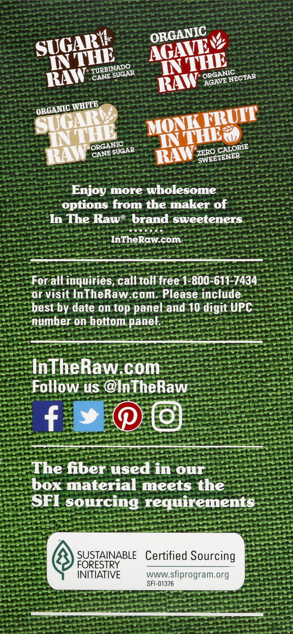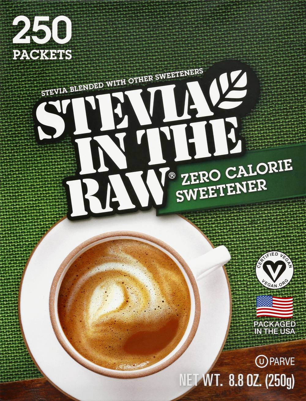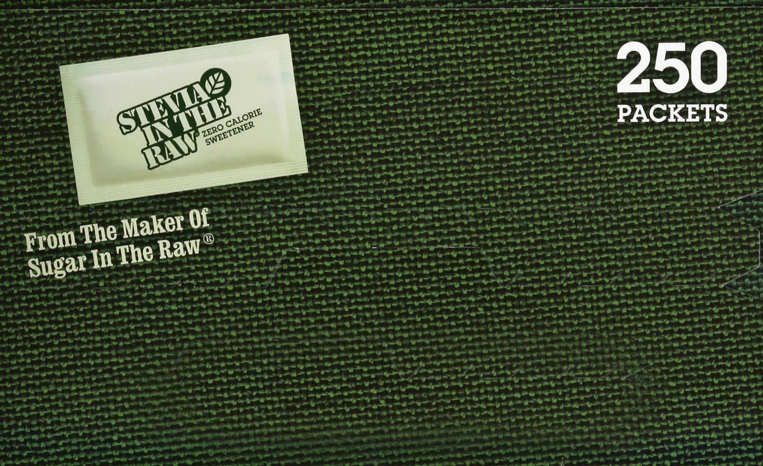 Stevia blended with other sweeteners. Certified Vegan. vegan.org. Vegan. 0 calorie. Naturally gluten free food. From the maker of sugar in the raw. Stevia in the Raw: Rooted in Brooklyn, the In The Raw sweetener family business began long before the natural food movement. Since introducing our original Sugar In The Raw in 1970, we have branched out into other sweetener sources found in nature giving us Agave In The Raw, Monk Fruit In The Raw, and a course Stevia In The Raw. That leads us to this box of zero-calorie Stevia In The Raw. Each packets has the sweetness of about two teaspoons of sugar, without all the calories. How sweet is that? No matter how you sweeten, the In The Raw family has just the right sweet for every taste. From the maker of sugar in the raw. Stevia is naturally sweeter than sugar. So, like many zero-calorie sweeteners, it is blended with dextrose. This helps create the perfect balance of sweetness, making it easier to both pour and measure. Each packet contains less than 4 calories per serving which the FDA considers dietetically zero. Sustainable Forestry Initiative: Certified sourcing. www.sfiprogram.org. Find recipes, tips and lots more at InTheRaw.com. Sugar In The Raw. Organic Agave In The Raw. Sugar In The Raw. Monk Fruit In The Raw. Enjoy more wholesome options from the maker of In The Raw brand sweeteners. InTheRaw.com. For all inquiries, call toll free 1-800-611-7434 or visit InTheRaw.com. Please include best by date on top panel and 10 digit UPC number on bottom panel. Follow us (at)InTheRaw Facebook; Twitter; Pinterest; Instagram. The fiber used in our box material meets the SFI sourcing requirements. Packaged in the USA. Number of servings: 250