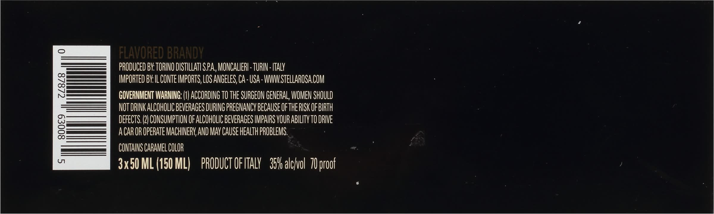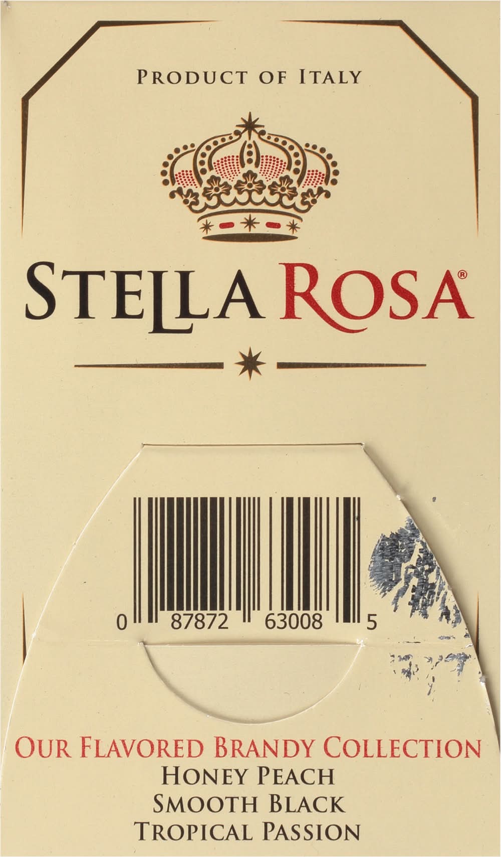 Our flavored brandy collection: Honey Peach, Smooth Black, Tropical Passion. Our flavored brandy collection. Riboli family. Spirits company. Small batch. Crafted in small batches, Stella Rosa flavored brandy is produced in the Northern Italian Foothills. Infused with natural flavors, enjoy its unique taste. Savor and Stellabrate every moment. Contains caramel color. www.stellarosa.com. 35% alc/vol 70 Product of Italy. Produced by: Torino Distillati S.P.A., Moncalieri – Turin – Italy. • Alcohol by volume: 35% • Il Conte Imports,