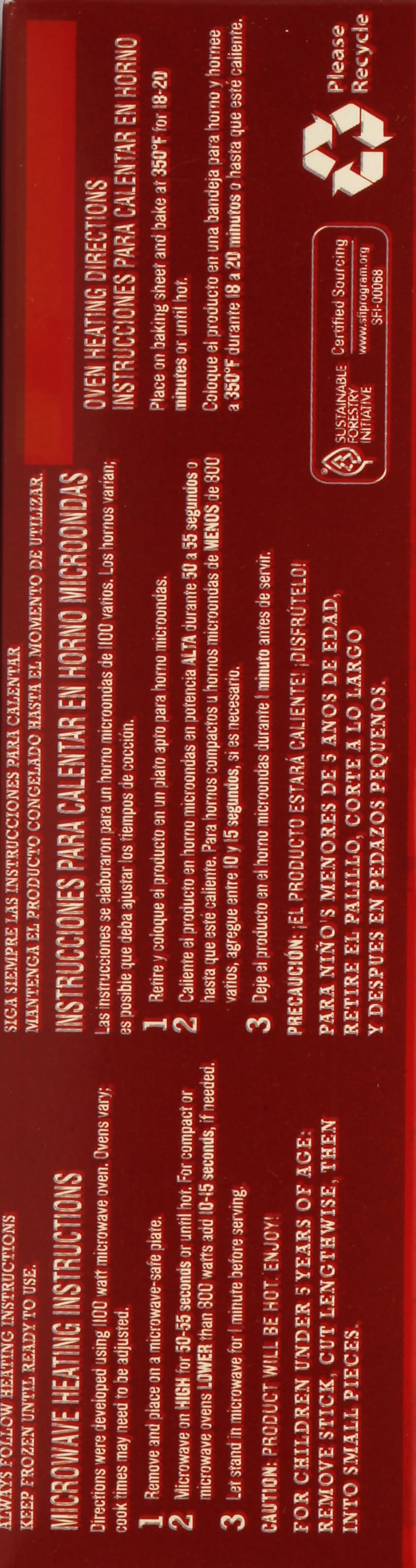 Always follow heating instructions. Keep frozen until ready to use. Microwave heating: Directions were developed using 1100 watt microwave oven. Ovens very; cook times may need to be adjusted. 1. Remove and place on a microwave-safe plate. 2. Microwave on high for 50-55 seconds or until hot. For compact or microwave ovens lower than 800 watts, add 10-15 seconds, if needed. 3. Let stand in microwave for 1 minute before serving. For children under 5 years of age: Remove stick, cut lengthwise, then into small pieces. Oven heating: Place on baking sheet and bake at 350 degrees F for 18-20 minutes or until hot.