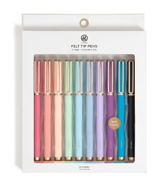 Write boldly with Catalina Felt Tip Pens with Colored Ink. This set of 10 pens features an assortment of vibrant colors with matching soft-touch barrels and gold accent hardware, adding an elegant touch to any stationery collection. The lightweight barrel provides a comfortable grip, and each pen features a (0.7 mm) medium point that effortlessly glides across the page, delivering smooth, bold lines in rich, assorted color ink. Perfect for any at-home, school, office, or on-the-go writing need. Color: Assorted