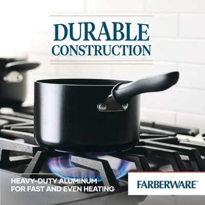 Everyday home cooks can count on the quality performance and easy cleaning of the Farberware Reliance Aluminum Nonstick 2-Quart Saucepan with Lid. The large saucepan features sturdy aluminum construction for efficient cooktop performance and fast, even heating throughout the pan base and sides. The pan interior is finished in durable nonstick that makes cleanup simple and helps promote healthier cooking, with less fats and oils required. The saucepan’s colorful exterior is easy to clean and adds a pop of kitchen style. Dishwasher safe for quick cleanup. Oven safe to 350°F. Farberware: The #1 Most Trusted Cookware Brand in America* *Voted Most Trusted Cookware Brand by American shoppers based on the 2022 Brandspark(r) American Trust study