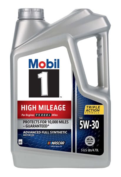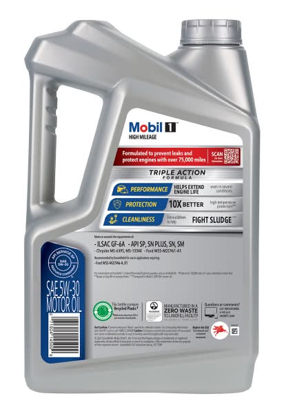 Mobil 1-High Mileage full synthetic motor oil 5W-30 is formulated for engines with over 75,000 miles, offering protection for up to 10,000 miles between oil changes. It meets ILSAC GF-6 standards, helping prevent low-speed pre-ignition and timing chain wear, while improving fuel economy and keeping your engine clean. With excellent heat protection up to 500°F and cold protection down to -30°F, this oil helps extend engine life by preventing sludge buildup and guarding against the 5-key factors that can damage engines over time.
