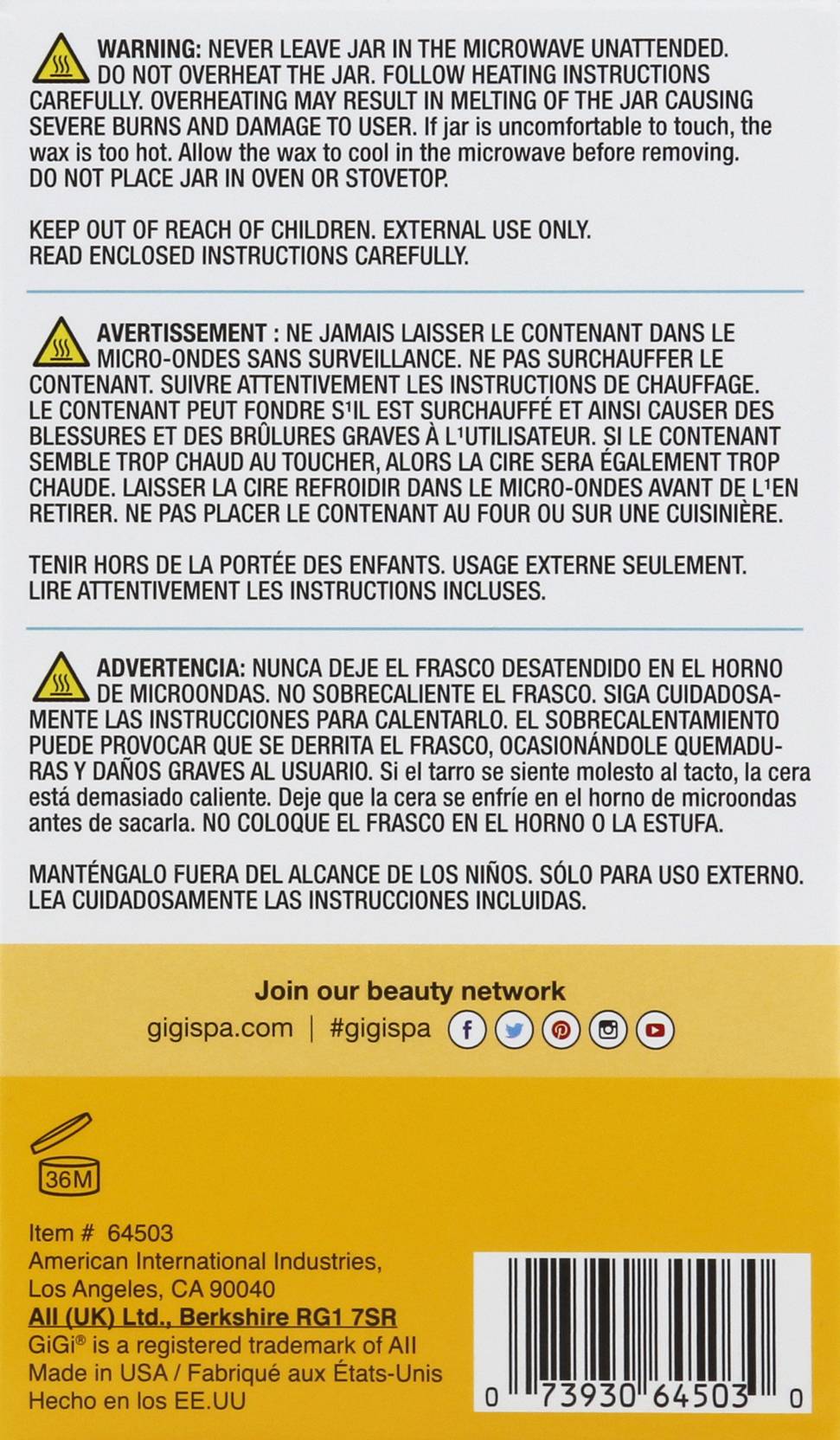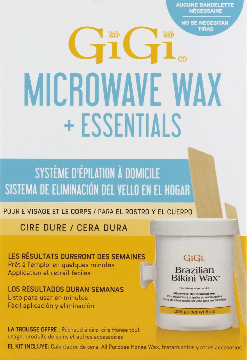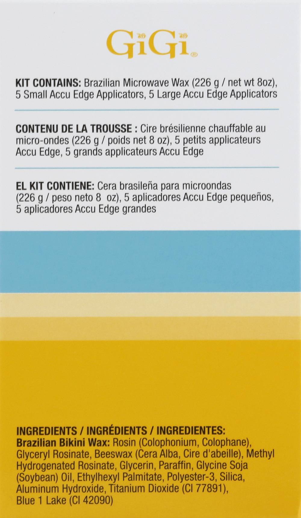 Microwave wax + essentials. No strips needed. Results last for weeks. Ready to use in minutes. Easy application removal. Kit Features: Brazilian microwave wax and applicators. Ahead of the curve. Kit Contains: Brazilian microwave wax (226 g/ net wt 8 oz); 5 small accu edge applicators; 5 large accu edge applicators. Join our beauty network gigispa.com. (hashtag)gigispa. Facebook. Twitter. Pinterest. Instagram. YouTube. Made in USA. American International,