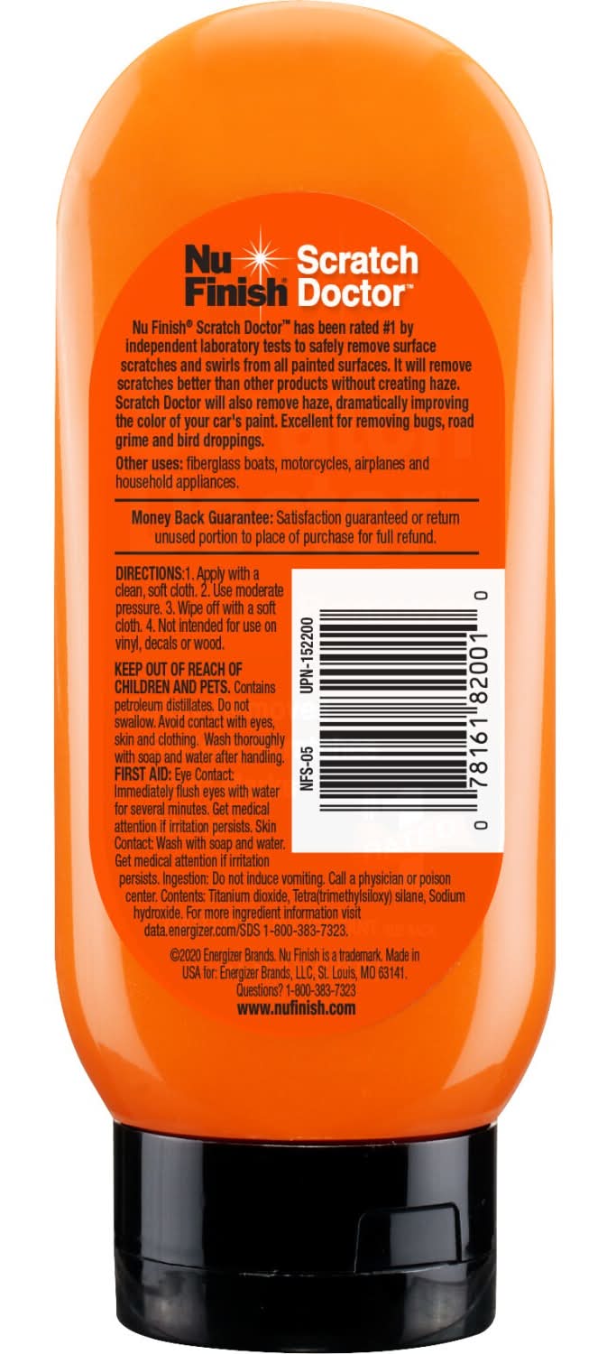 Nu Finish Scratch Doctor is your go-to, non-abrasive scratch remover for safely removing surface scratches, scuff marks, and swirl. Removes bugs, bird poop, and road grime while improving the color of your car by also eliminating haze. Simply apply with a clean, soft cloth using moderate pressure, wipe off, and say goodbye to scratches. Ideal for cars, trucks, boats, motorcycles, and chrome household appliances (not intended for use on vinyl, decals, or wood). Leading Scratch Remover.