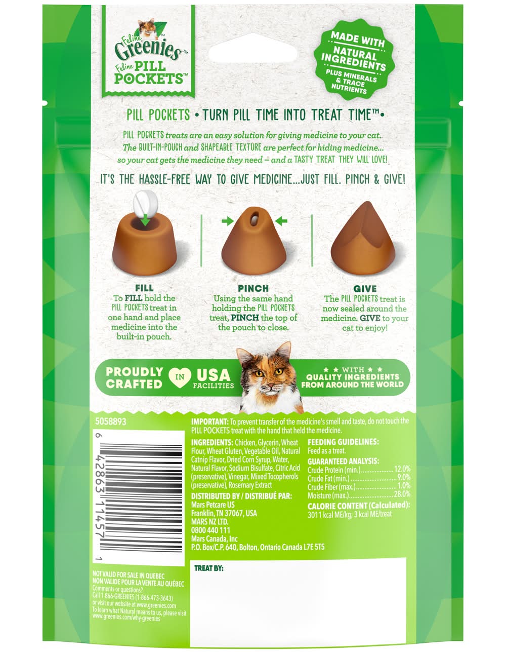 Take the stress out of giving your cat their medicine. FELINE GREENIES PILL POCKETS Treats for Cats easily hide most tablet-sized and capsule-sized pills in a great-tasting meaty treat that’s made with natural ingredients plus minerals and trace nutrients. These soft cat treats are the #1 vet recommended choice for giving pills* and feature a delicious catnip flavor that helps disguise the taste of the medicine. It's the hassle-free way to give your cat medicine... just place their medicine inside the pocket, pinch the pocket closed to secure the pill or capsule, and share with your cat. Just like that, the treat (and medicine) disappears. When it comes to taking meds, your cat is smart. But you're smarter... because you've got FELINE GREENIES PILL POCKETS Cat Treats. * Based on a survey of U.S. veterinarians