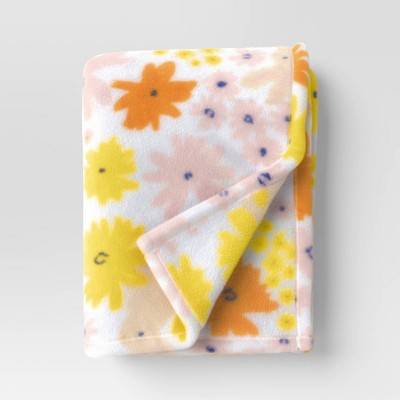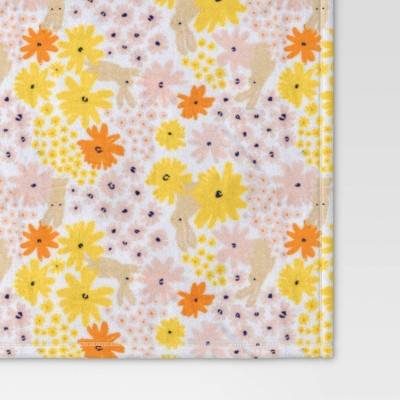Room Essentials Poly Printed Floral and Bunny Easter Plush Throw Blanket, White-Yellow