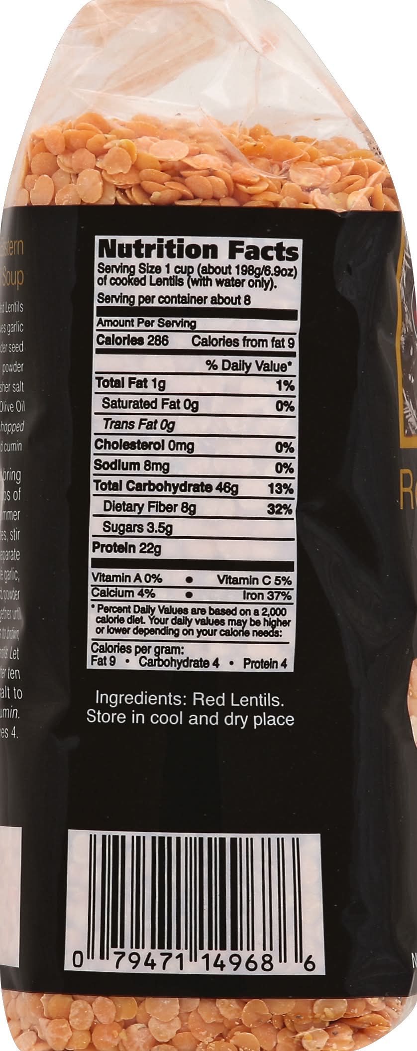 Directions: Store in a cool and dry place. General Cooking Instructions: Rinse and drain Red Lentils. Add 7 cups of water; simmer gently with lid tilted for about 40 minutes or until tender.